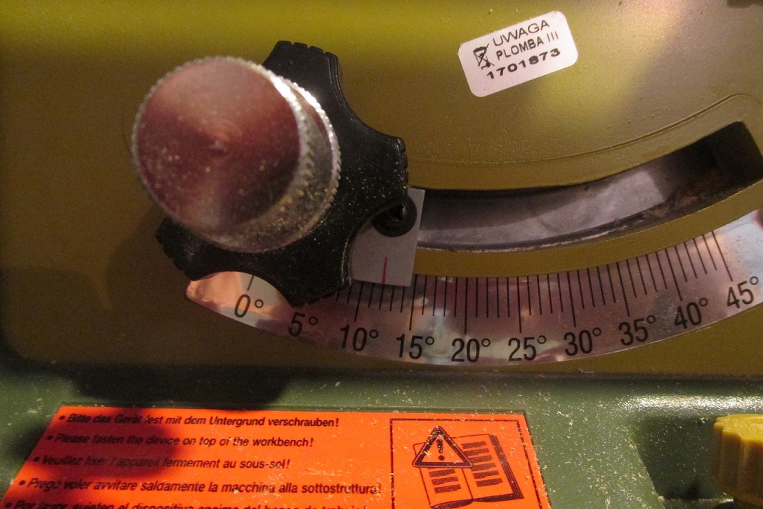 Przed fazowaniem listew, przygotowałem piłę. Nachylona tarcza wymaga szerszego otworu, do którego fazowana listwa mogłaby "zanurkować".
