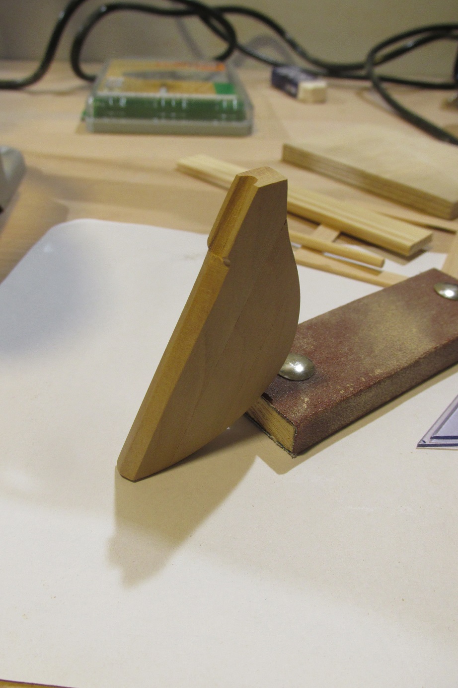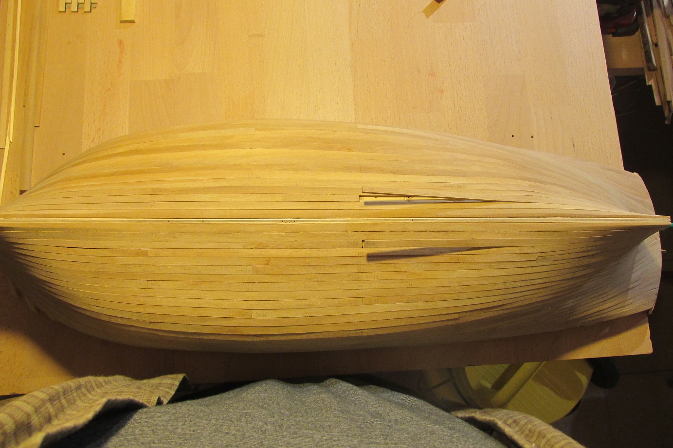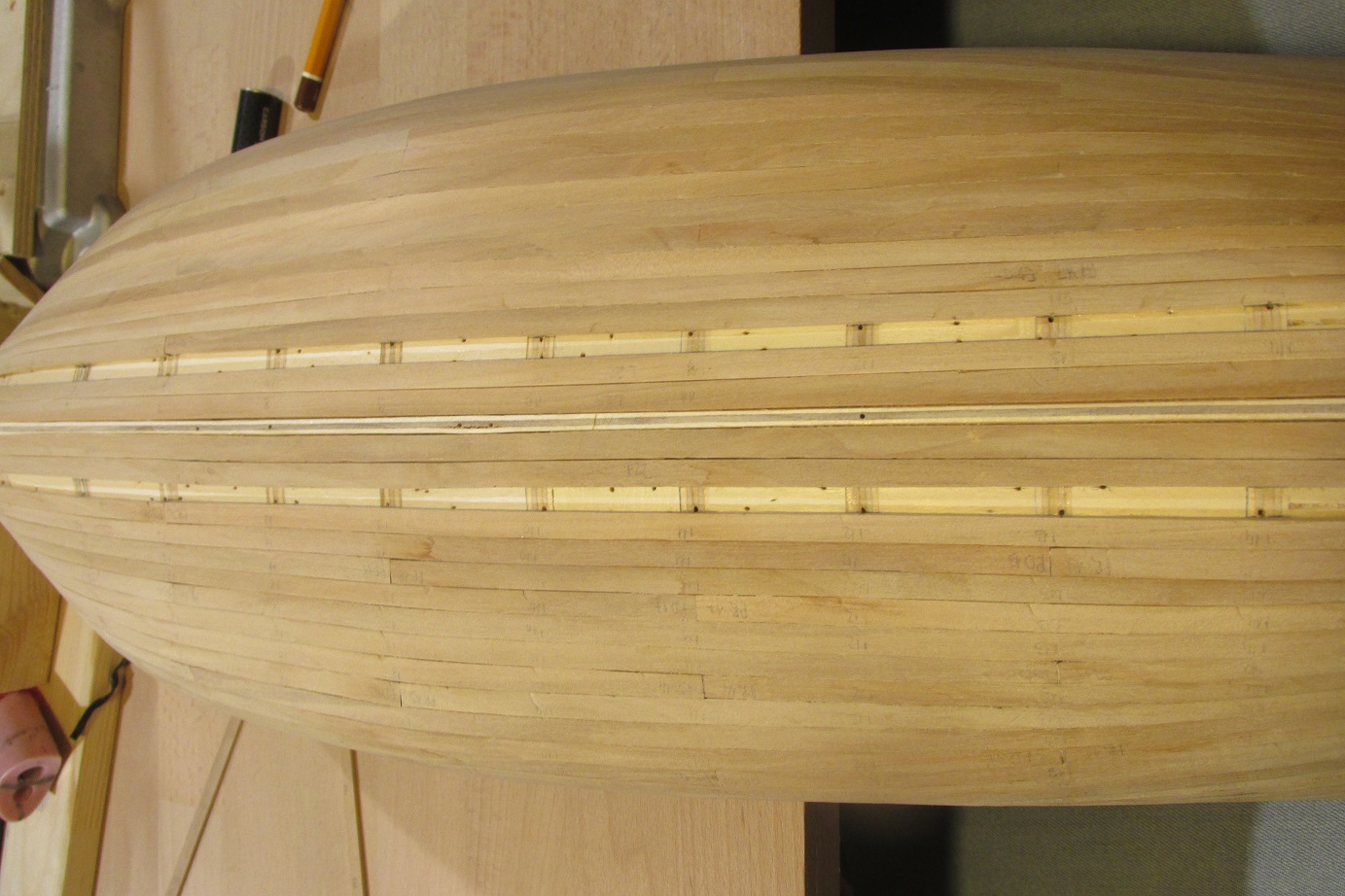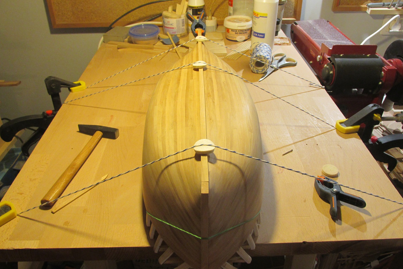 Nastąpił przełom, skończyłem wreszcie poszywanie :-) Mam nadzieję, że teraz pomimo braku czasu zacznie się dziać więcej. Dla tych, którzy zabierają się za poszywanie po raz pierwszy, tak jak ja, przestroga: z pinezkami trzeba ostrożnie. Ja trochę narobiłem wgnieceń, następnym razem będę używał podkładek z miękkiego drewna (jeśli będzie następny raz :-)). Druga rzecz to łączenie planek po długości w jednym rzędzie, tam też zabrakło mi uwagi. Po trzecie podczas dopasowywania planek, lepiej użyć tylko hebelka a papieru tylko do wyrównania. W miejscach gdzie próbowałem formować papierem, listwy nie są idealnie spasowane. Czyli nie jest łatwo robić pierwszy model :-) Ale na tym polega nauka :-)