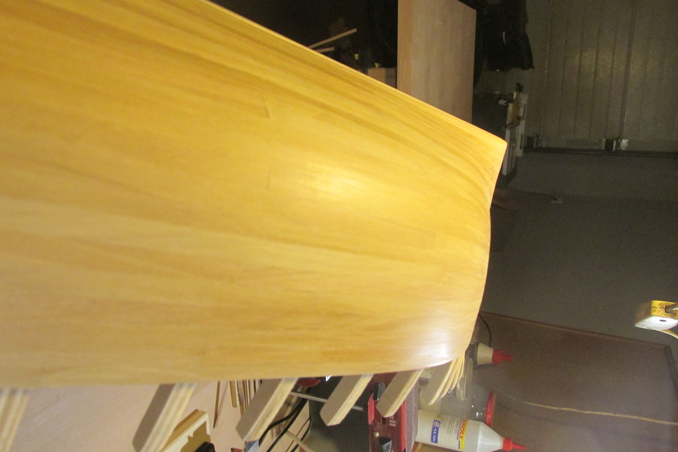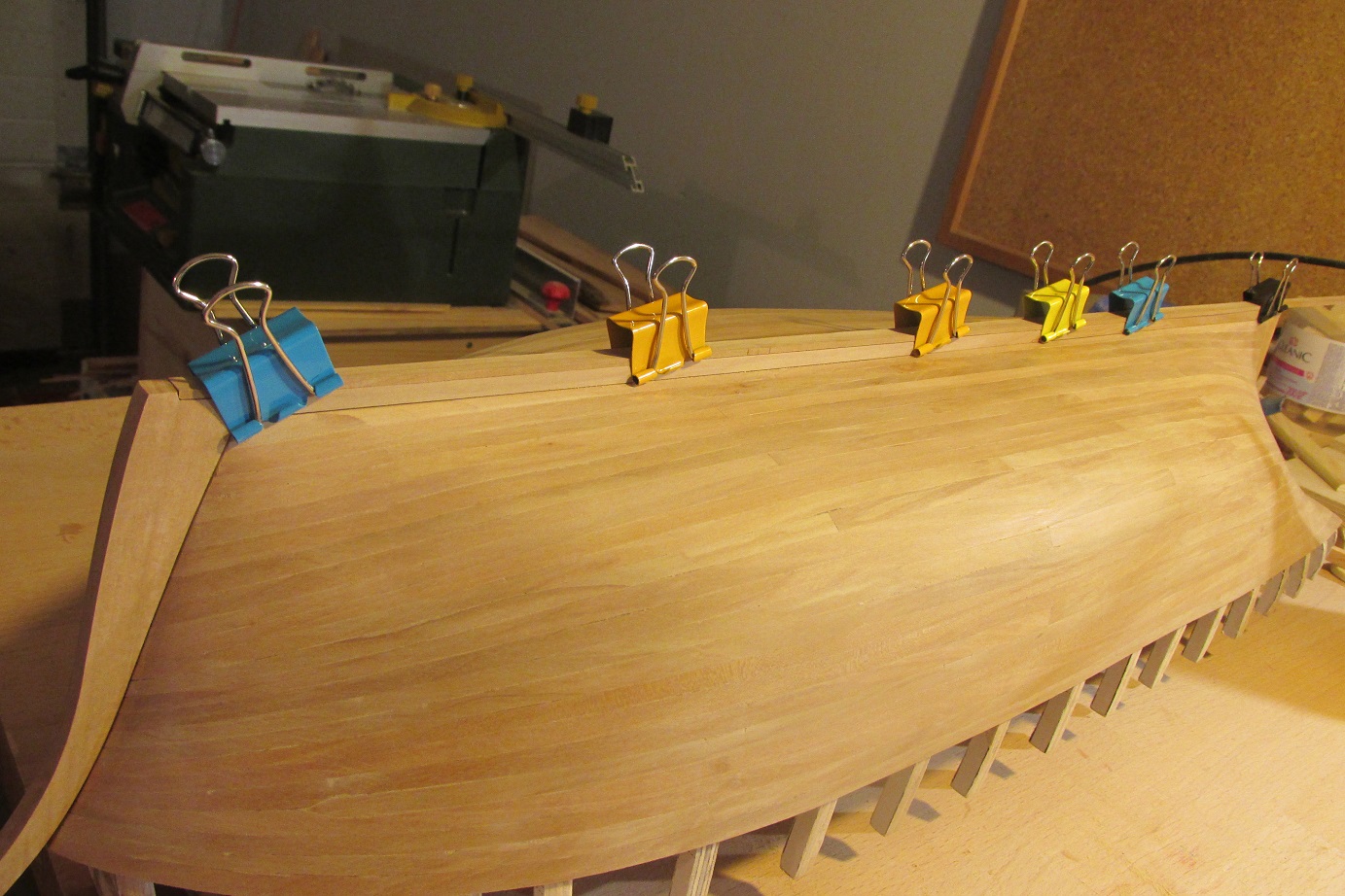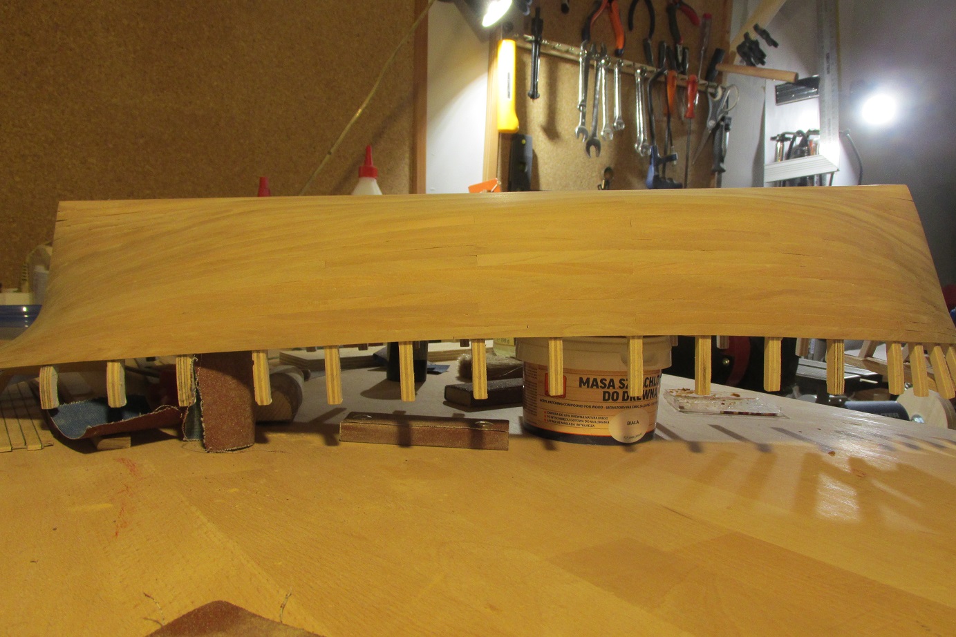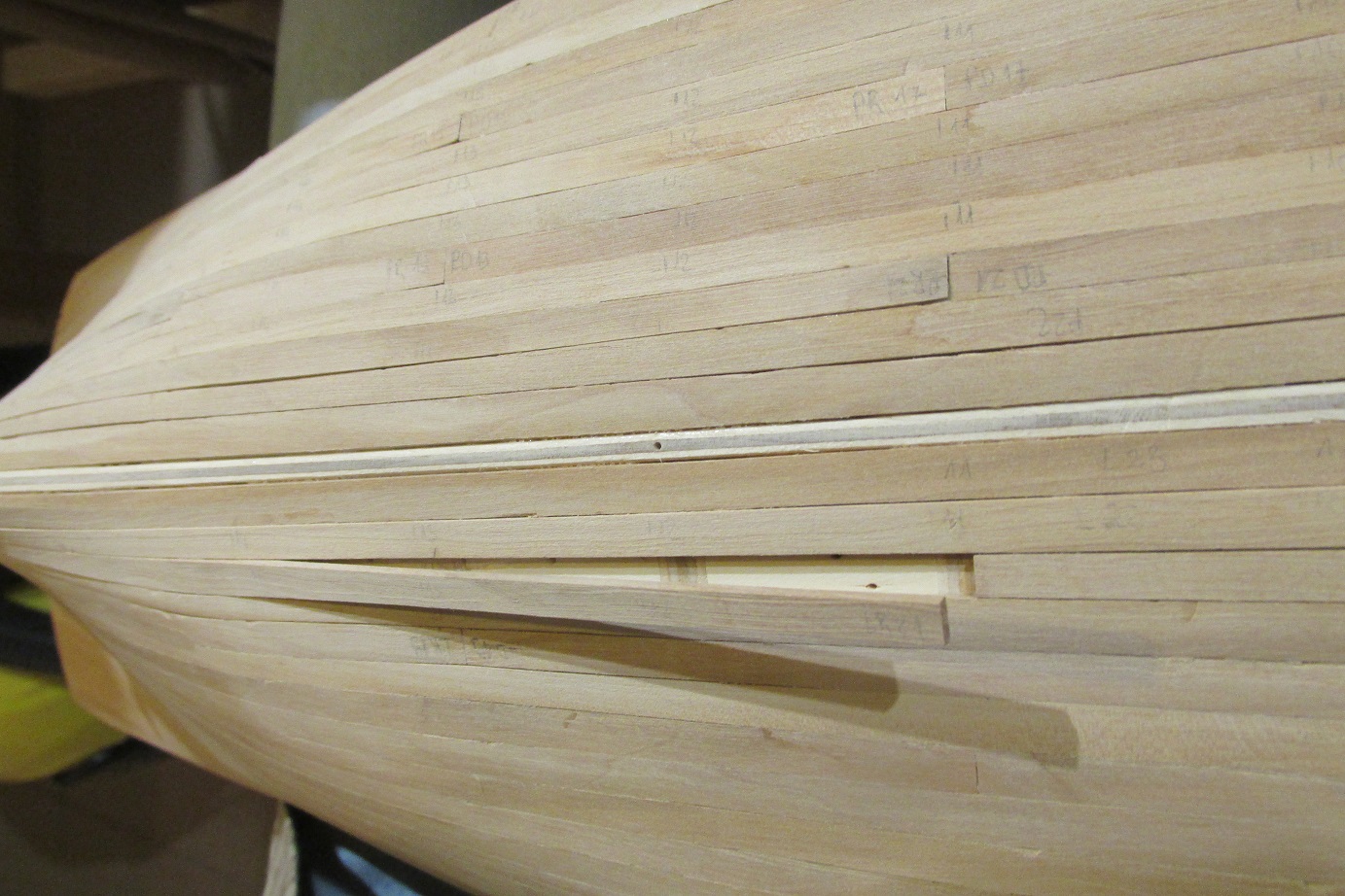 Nastąpił przełom, skończyłem wreszcie poszywanie :-) Mam nadzieję, że teraz pomimo braku czasu zacznie się dziać więcej. Dla tych, którzy zabierają się za poszywanie po raz pierwszy, tak jak ja, przestroga: z pinezkami trzeba ostrożnie. Ja trochę narobiłem wgnieceń, następnym razem będę używał podkładek z miękkiego drewna (jeśli będzie następny raz :-)). Druga rzecz to łączenie planek po długości w jednym rzędzie, tam też zabrakło mi uwagi. Po trzecie podczas dopasowywania planek, lepiej użyć tylko hebelka a papieru tylko do wyrównania. W miejscach gdzie próbowałem formować papierem, listwy nie są idealnie spasowane. Czyli nie jest łatwo robić pierwszy model :-) Ale na tym polega nauka :-)