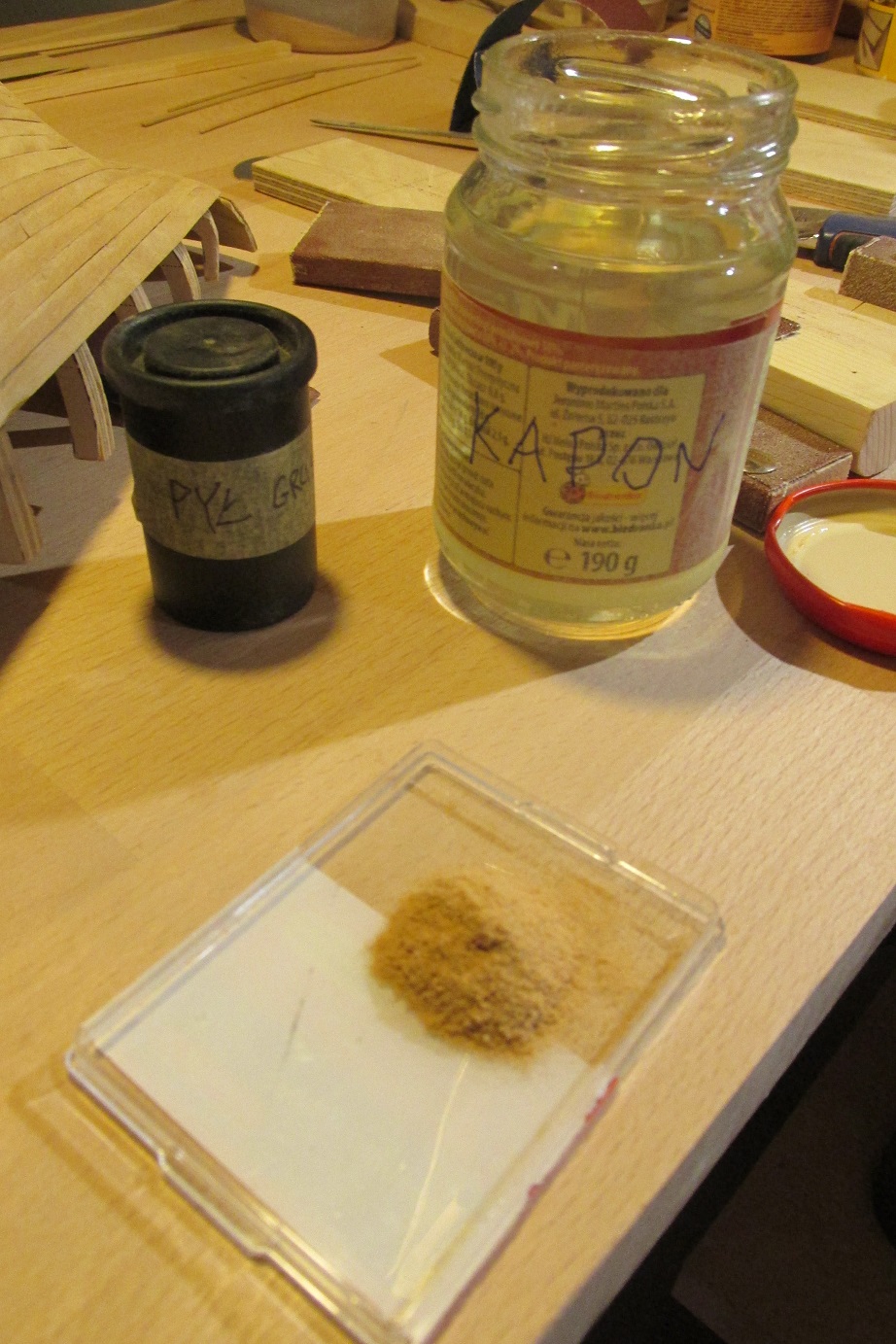 Robiłem wcześniej testy wypełniania drobnych szczelin między plankami. Składniki to pył z gruszy (odzysk z ścierania listew na poszycie :-)) oraz kapon. Po szpachlowaniu trzeba odczekać aż masa zaschnie, potem delikatnie szlifuję i efekt jest zadowalający, przynajmniej dla mnie początkującego.