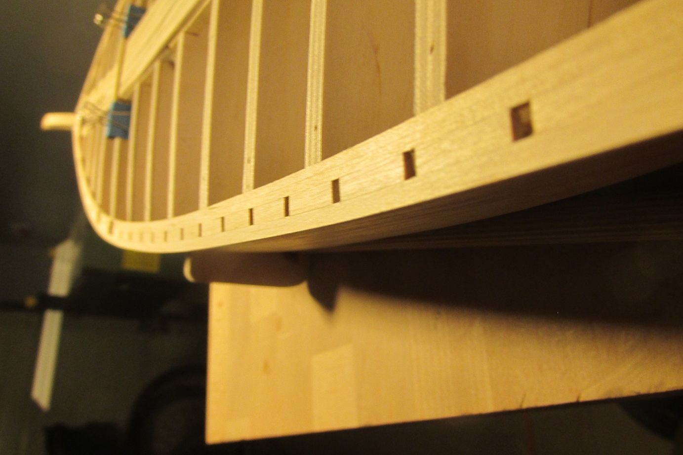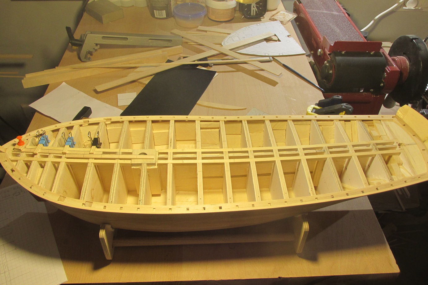 Ciągle jestem na etapie wykonywania pokładu. Sięgnąłem do zasobów wiedzy teoretycznej (bo innej nie posiadam i nie da się takiej znaleźć w internecie) i naczytałem się o układach kładzenia desek pokładowych. Spośród tych na które napotkałem, najbardziej podoba mi się "every 5" w układzie 13524. Sporządziłem więc plan odręczny :-) i rozpocząłem pieczołowicie prace :-) Deski będą miały długość 120 cm co oznacza że przy tym układzie będą podzielone na 2,4 mm. Naciąłem więc listew o milimetr dłuższych, aby móc je wyrównać na szlifierce do dokładnego wymiaru i nakleiłem (tu cytat z klasyka :-)) "znanym i lubianym" sposobem na czarny papier. Reszta na fotkach i w komentarzach. Zapraszam i pozdrawiam,