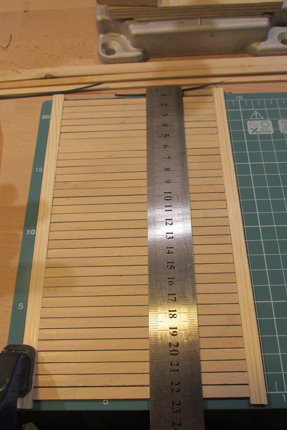 tak ułożone listewki dzielę na pięć równych części czyli w moim przypadku 2,4 cm. Te linie przydadzą się też później podczas kołkowania.