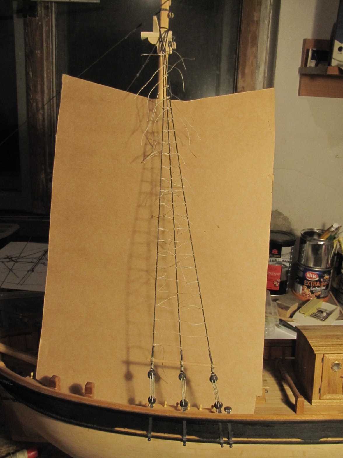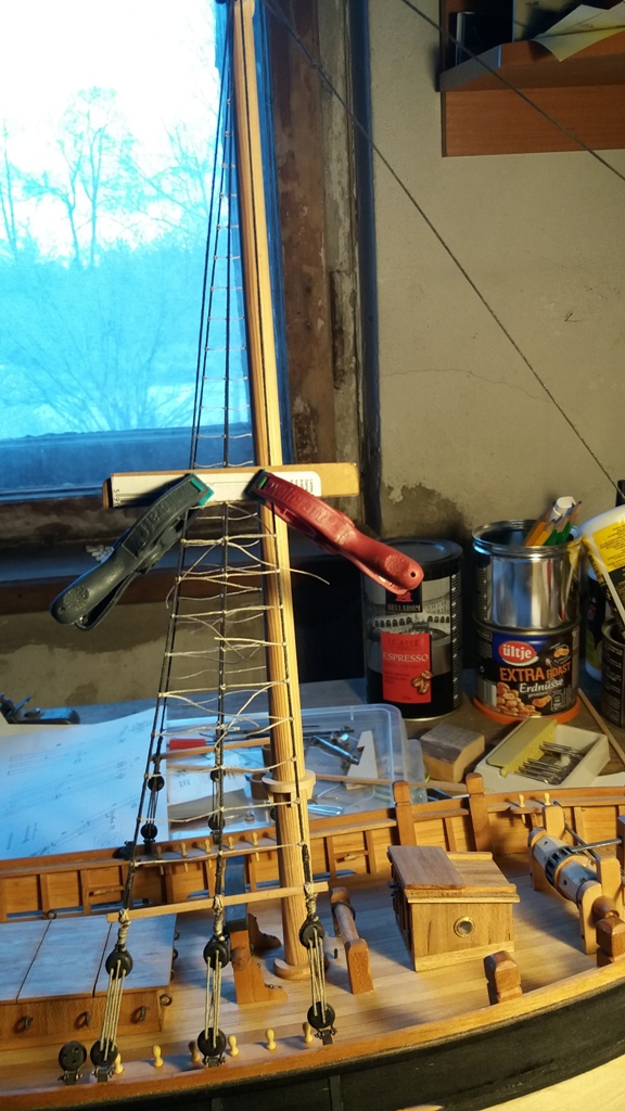 wiązanie ratlin na wantach grotmasztu skończone, aby odreagować żmudne i raczej nudnawe ich wiązanie zrobiłem dziś podstawkę roboczą dla Karolka & Marysi:
