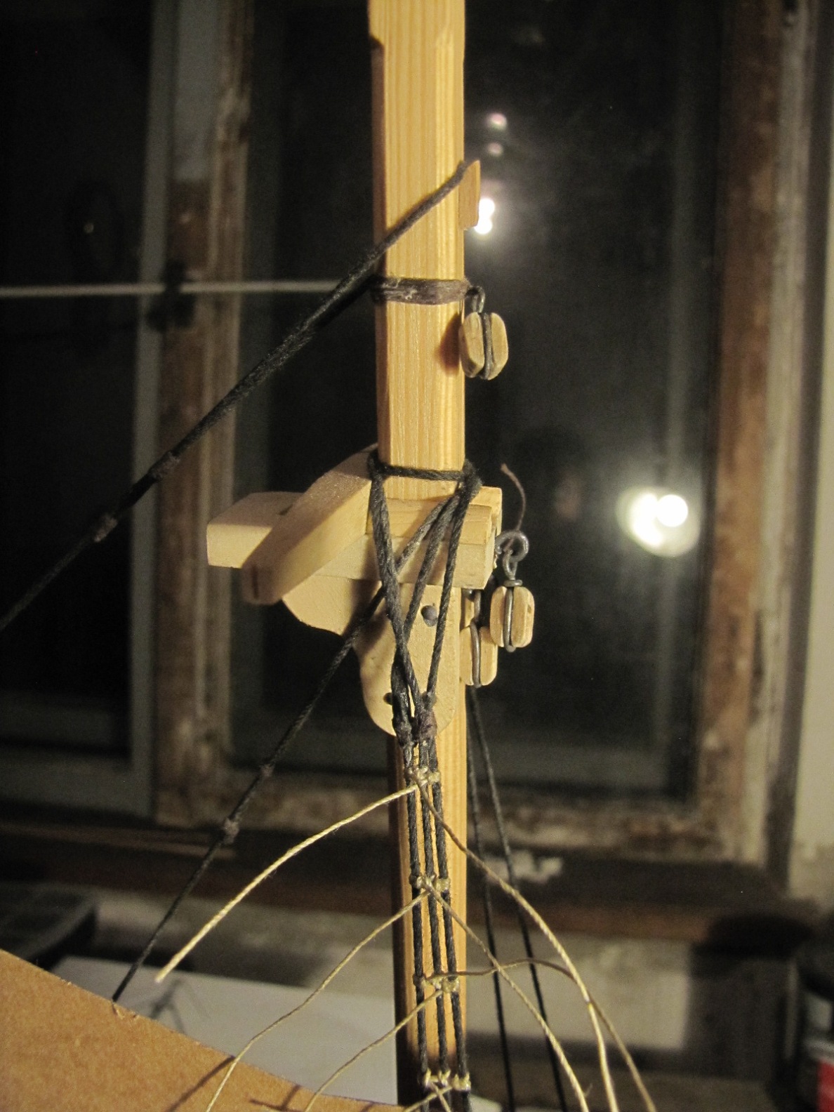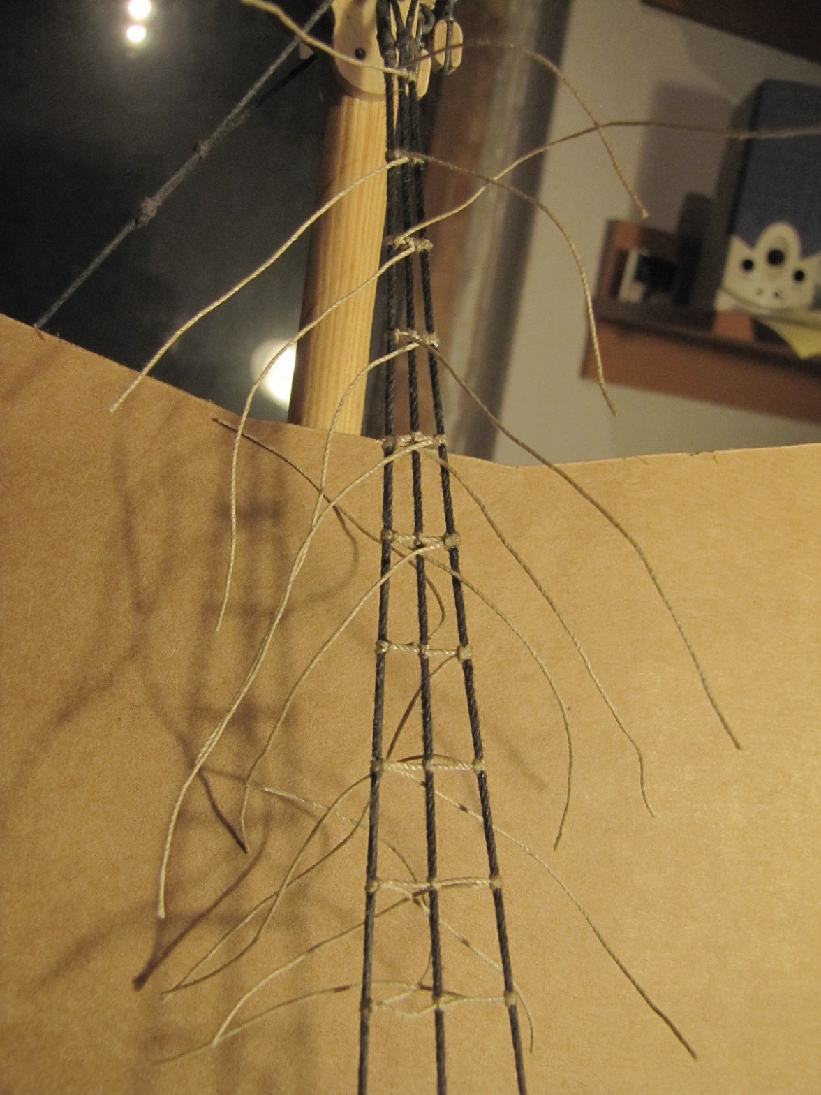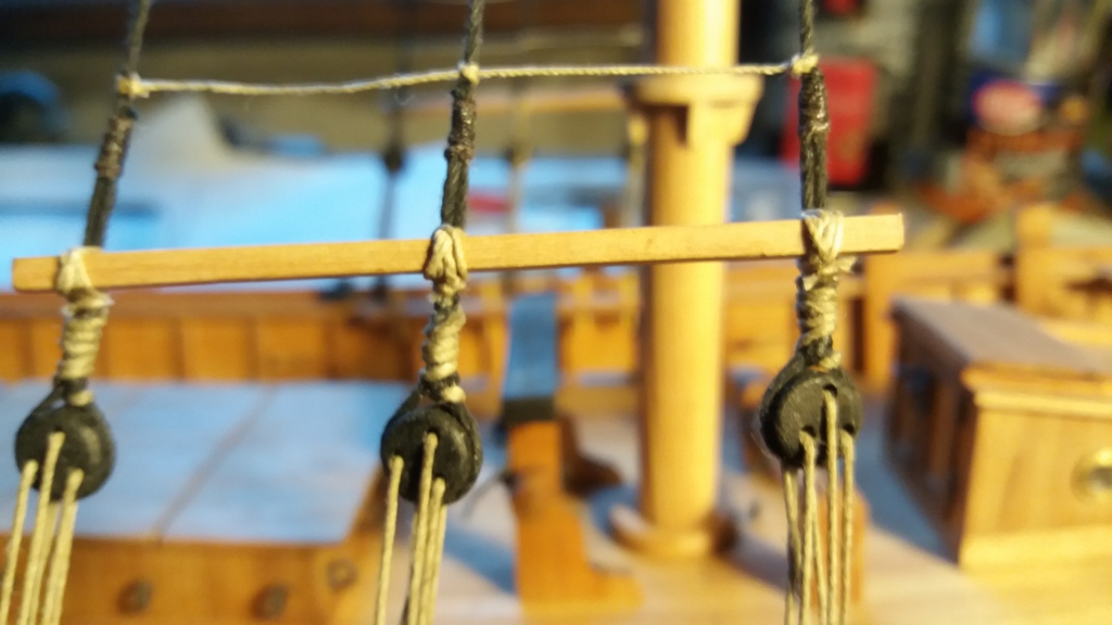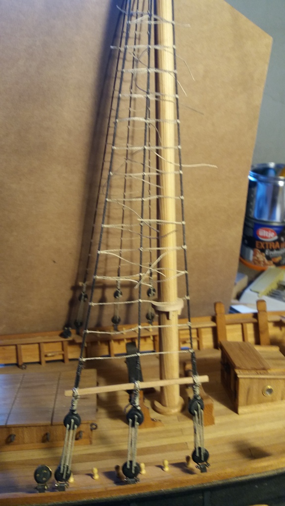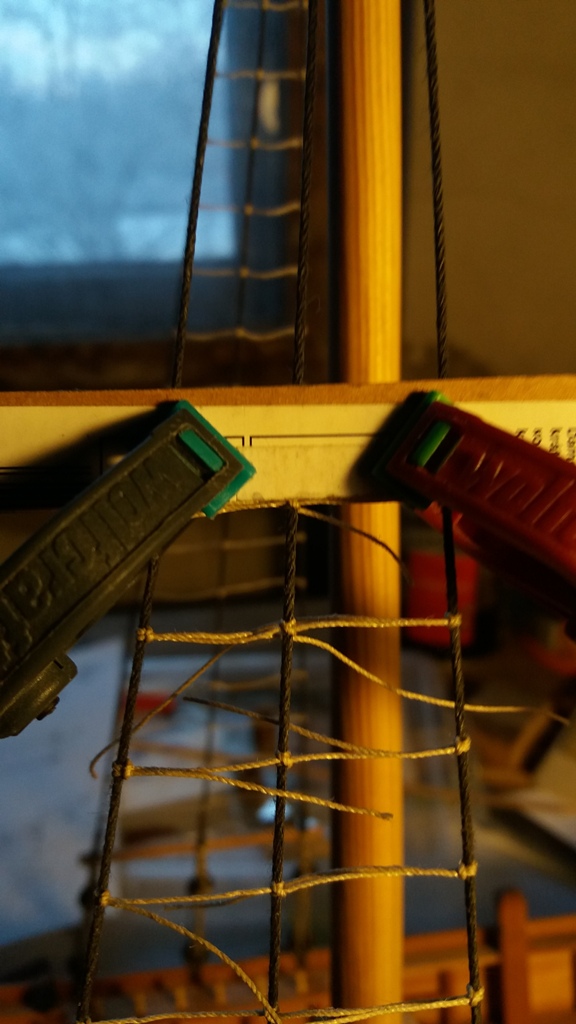 Powoli zbliżam się do zakończenia wiązania ratlines na wantach grotmasztu. W sumie wyszło 25 szczebli na każdej burcie. Daje to odległość pomiędzy szczeblami ~13 mm co w rzeczywistości odpowiada ok. 39 cm.