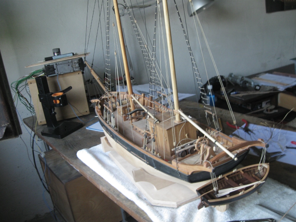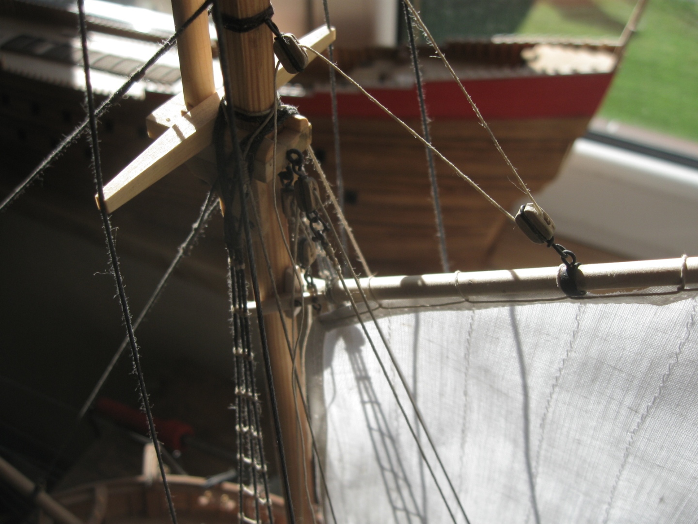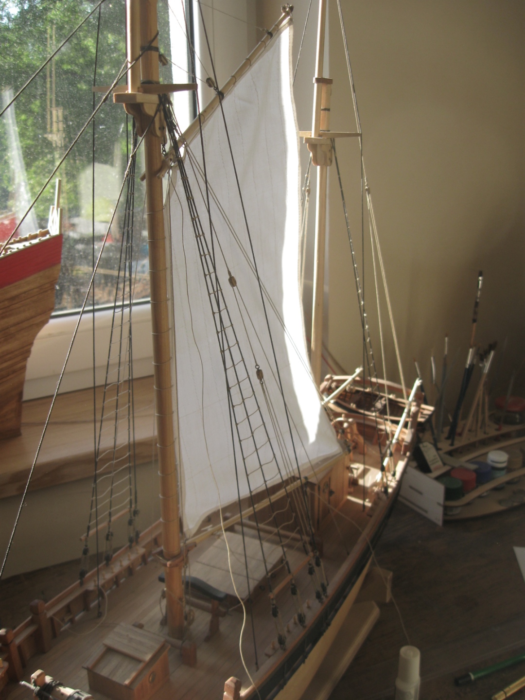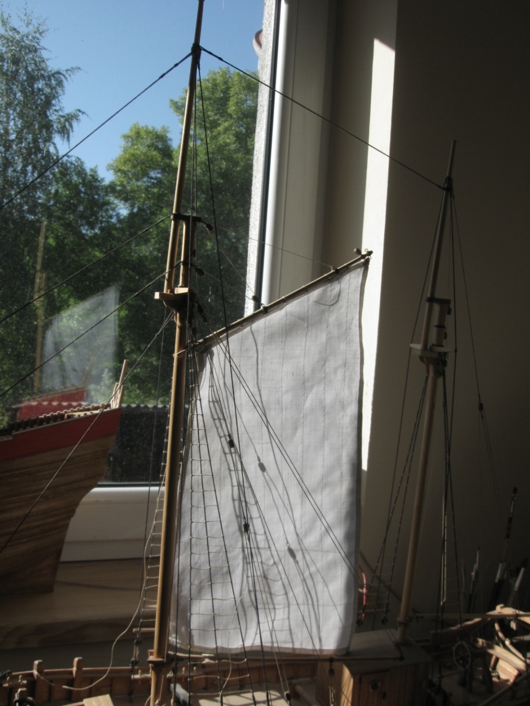 wracam do mojego modelu, poprosiłem siostrę o uszycie żagli, rozpocząłem zmagania z ożaglowaniem: