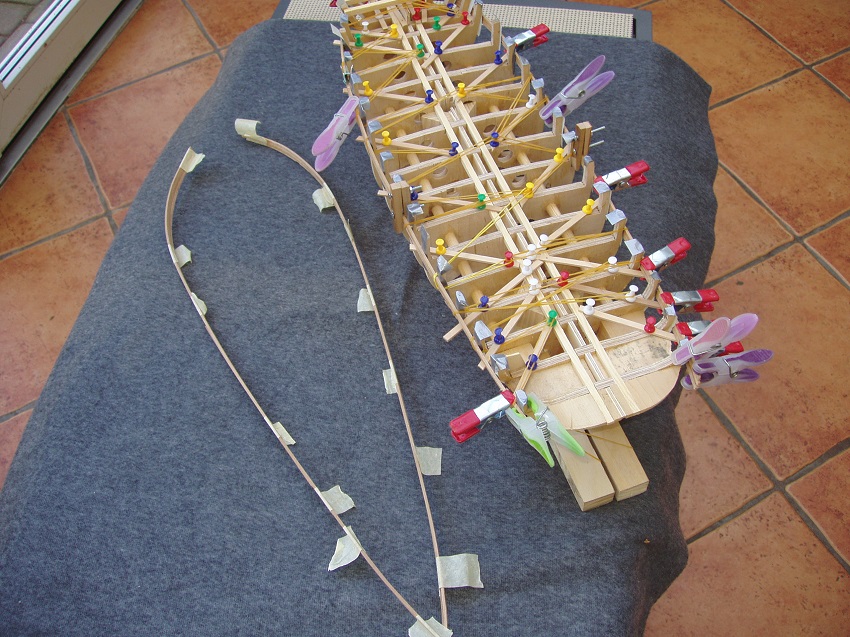 Poszywanie kadłuba już "z górki". 20 planek na każdej burcie jest wklejone, a pozostało już tylko po 8 szt. Dziennie wklejam po jednej parze - taka technologia. Wyciętą przy pomocy imadła opisanego w dziale Narzędzia plankę zanurzam w wodzie na 10-15 minut i mokrą mocuję na szkielecie by wyschła przez całą noc. Następnego dnia uformowaną plankę doszlifowuję do przekroju trapezowego i do styczności z planką poprzednią. Potem już tyko klej. Do mocowania planek używam głównie gumek recepturek o zawartości 60% naturalnego kauczuku. Pękła mi tylko jedna recepturka. Technologia ta pozwoliła uniknąć śladów po pineskach.