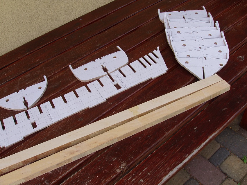 Za pomocą wcześniej pokazanych narzędzi frezem pociłem listewki z brzozy i olchy. Gruszą było gorzej, już przy listewkach 3 mm grzał się i trzeba było coś wymyśleć by nie zniszczyć narzędzia. Próbowałem następnie z tarczą z widją ale z uwagi na małą ilość zębów(24 przy fi tarczy 80 mm) efekt był kiepski. Dla sprawdzenia, bez wielkiej nadzieji założyłem tarczę radziecką będącą na wyposażeniu . Jakież było moje zdziwienie że ta piłowała nawet gruszę 10 mm bez żadnych problemów. Są listewki jest też dość dobra wilgotność w moim warsztacie to zacząłem kleić sekcje nadburcia.Wąsy wręg służą jako szablon które będą odcięte wzorując się na koledze Paliwiaku.