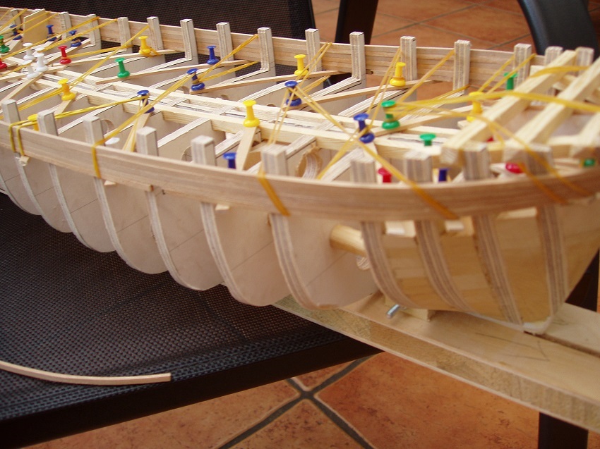 Poszywanie kadłuba już "z górki". 20 planek na każdej burcie jest wklejone, a pozostało już tylko po 8 szt. Dziennie wklejam po jednej parze - taka technologia. Wyciętą przy pomocy imadła opisanego w dziale Narzędzia plankę zanurzam w wodzie na 10-15 minut i mokrą mocuję na szkielecie by wyschła przez całą noc. Następnego dnia uformowaną plankę doszlifowuję do przekroju trapezowego i do styczności z planką poprzednią. Potem już tyko klej. Do mocowania planek używam głównie gumek recepturek o zawartości 60% naturalnego kauczuku. Pękła mi tylko jedna recepturka. Technologia ta pozwoliła uniknąć śladów po pineskach.