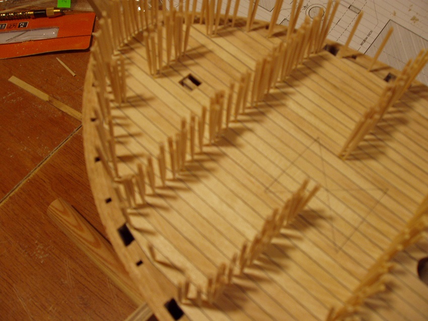 Post ze specjalną dedykacją dla kol Ostrego. Zrobiłem kołkowanie wykałaczkami brzozowymi i wkleiłem falszburty. O kołkowaniu nie ma co pisać bo temat oklepany. Wklejenia nadburci uformowanych na pierwotnym szkielecie sam się też trochę obawiałem ale okazało się że nie taki diabeł straszny.... Najpierw przygotowałem wsporniki o profilu dopasowanym do falszburt w miejscach gdzie będą wklejone. Same nadburcie przymocowałem "na sucho" do burt tak jak powinno ono leżeć w efekcie końcowym. Pozwoliło to określić kąty pod jakim względem pokładu powinny być wklejone wsporniki. Następnie już na klej wstawiłem co drugi wspornik na dziobie i rufie oraz co trzeci na śródokręciu. Powstał jakby nowy szkielet do którego łatwo już wkleić falszburty i resztę wsporników. Wszystko zachowało pierwotny wymagany kształt. Metoda ta ma ten plus że pozwala łatwo oczyścić i szlifować nadburcia nie tylko po zewnętrznej stronie ale również od wewnątrz. A teraz kilka fotek.