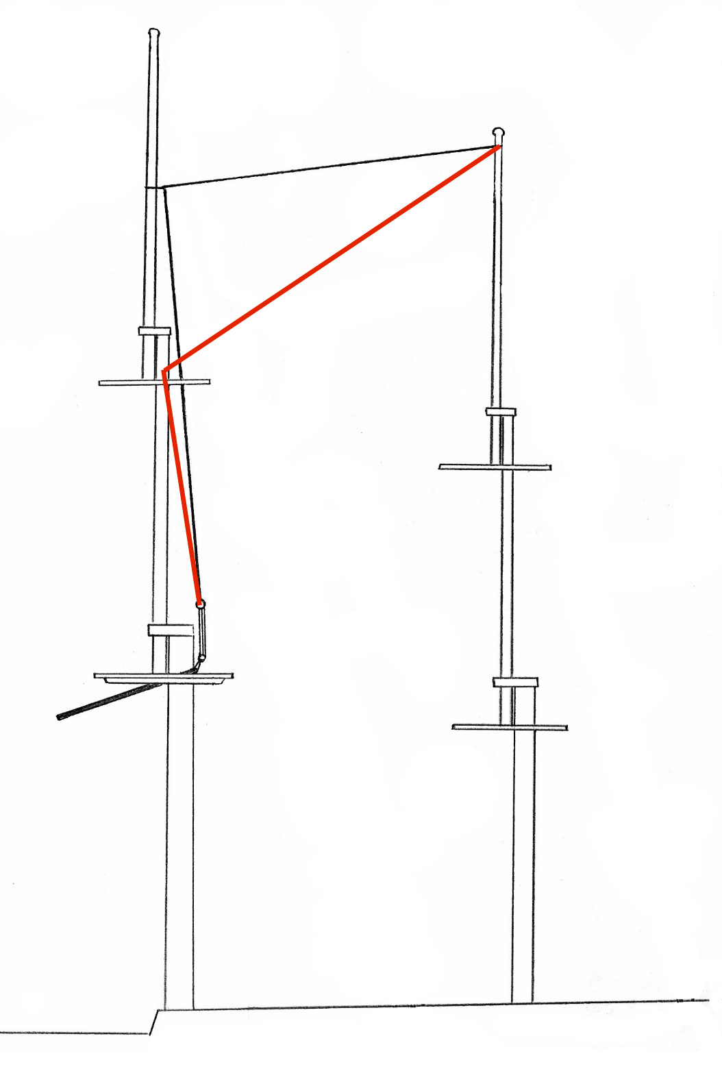 Słuszna uwaga Tomku. Opis przebiegu tego sztagu jest prawidłowy, natomiast źle wykonałem rysunek. Ten sztag powinien przebiegać tak, jak na rysunku zaznaczyłem to kolorem czerwonym.