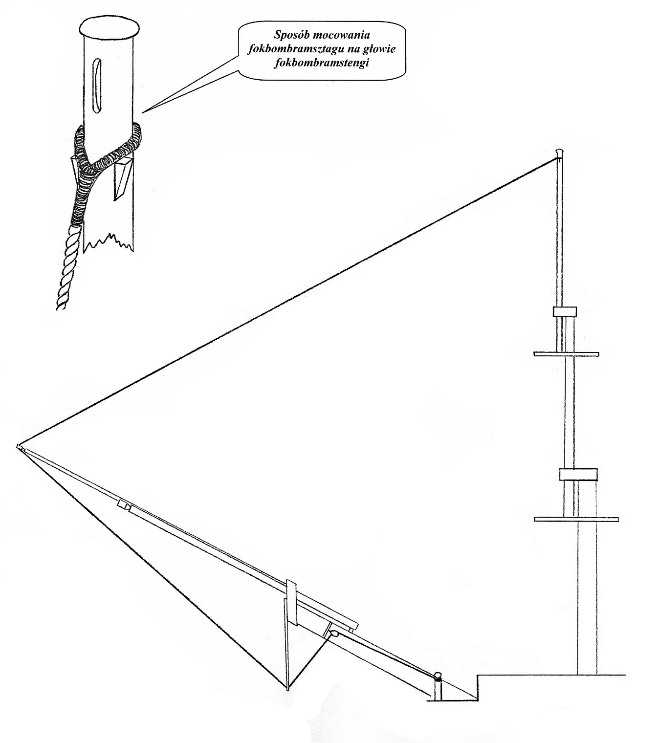 3) Dolna część grotbombramsztagu zakończona jest okiem z kauszą, które mocowane jest za pomocą przewiązu z kauszą w stropie zamocowanym do sztagu pomocniczego foka, za głową kolumny fokmasztu.