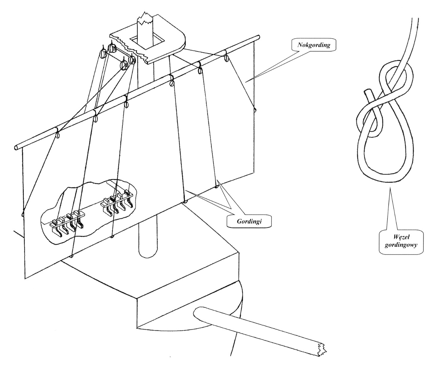 Nokgordingi (leech lines) – (śr. 0,2 mm) stała część liny mocowana jest węzłem gordingowym (buntline hitch) do ucha na liku bocznym foka; dalej lina przechodzi przez pojedynczy blok (dł. 2,5 mm) zamocowany przewiązem do fokrei (na wysokości pierwszych szelek perty licząc od noku rei), następnie przez zewnętrzny krążek, zewnętrznego, podwójnego bloku (dł. 3 mm) zawieszonego pod platformą marsa (ten blok wykorzystywany jest również do brasu blindy). Dalej lina przechodzi przez bliźniaczy blok zamocowany pod platformą marsa, w jej rufowej części, następnie w dół do pokładu gdzie odkładana jest na 1 i 8 pachołku na rufowej belce na fordeku (obok dzwonnicy).