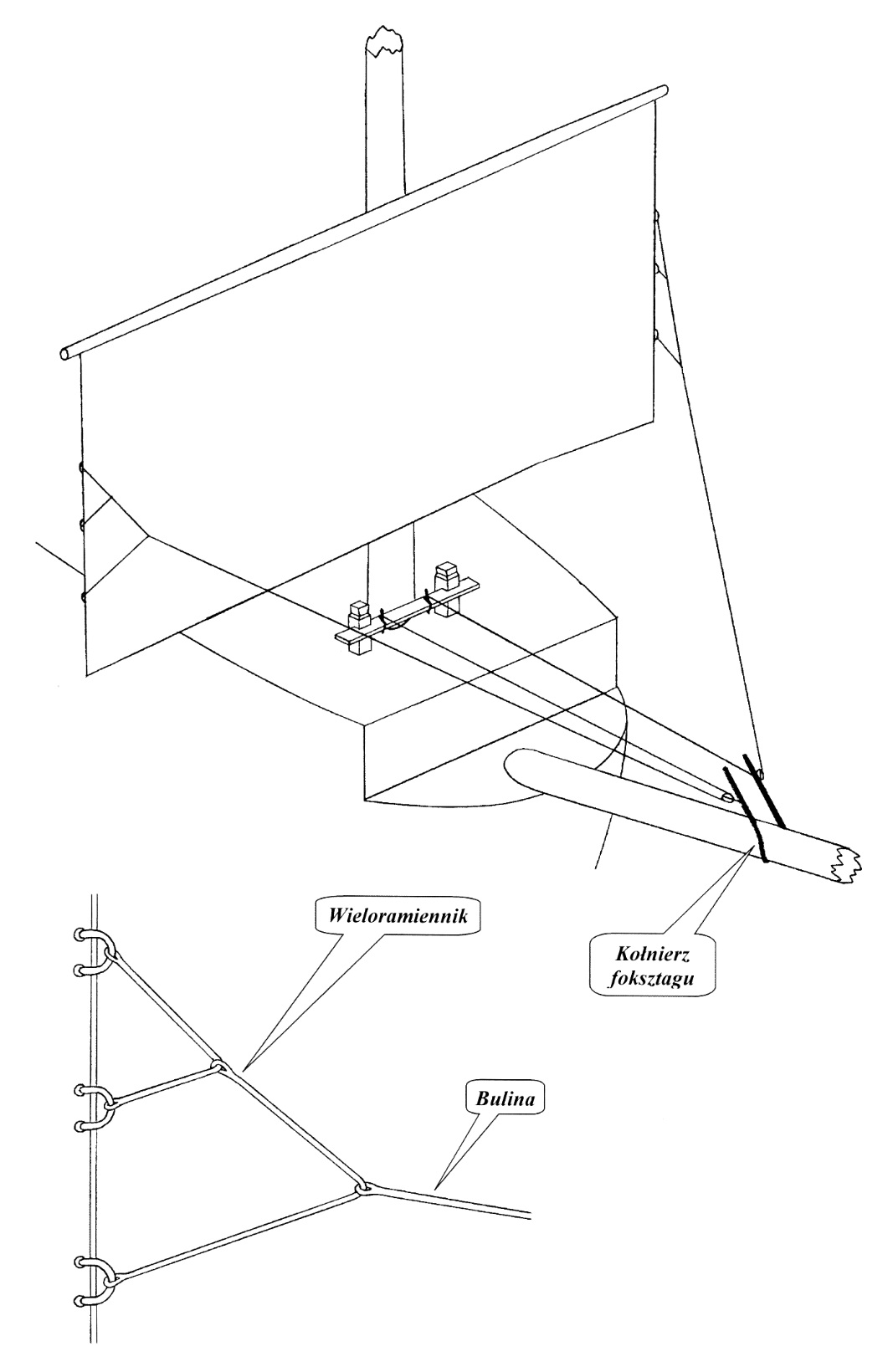 Bulina (bowline) – (śr. 0,37 mm) – do uch na liku bocznym żagla zamocowane są dwie liny (bridles) tworzące wieloramiennik. Liny mocowane są w ten sposób, że górna lina tworząca wieloramiennik jest mocowana do górnego ucha buliny na liku bocznym, następnie przechodzi przez oko utworzone w linie wieloramiennika znajdującej się poniżej i mocowana jest do kolejnego, niższego ucha na liku bocznym żagla. Kolejna, niżej położona lina wieloramiennika, która w górnej części połączona jest z górną liną, w dolnej części jest mocowana do kolejnego, trzeciego ucha na liku bocznym żagla. Do tego wieloramiennika, do jego najniżej położonej liny, za pomocą oka szplajsowego zamocowana jest bulina. Bulina biegnie w kierunku dziobu gdzie przechodzi przez pojedynczy blok (dł. 4 mm) zamocowany przewiązem do kołnierza foksztagu. Po przejściu przez blok bulina biegnie w kierunku rufy i ostatecznie jest odkładana na 1 i 9 naglu kołkownicy znajdującej się przed kolumną foka.