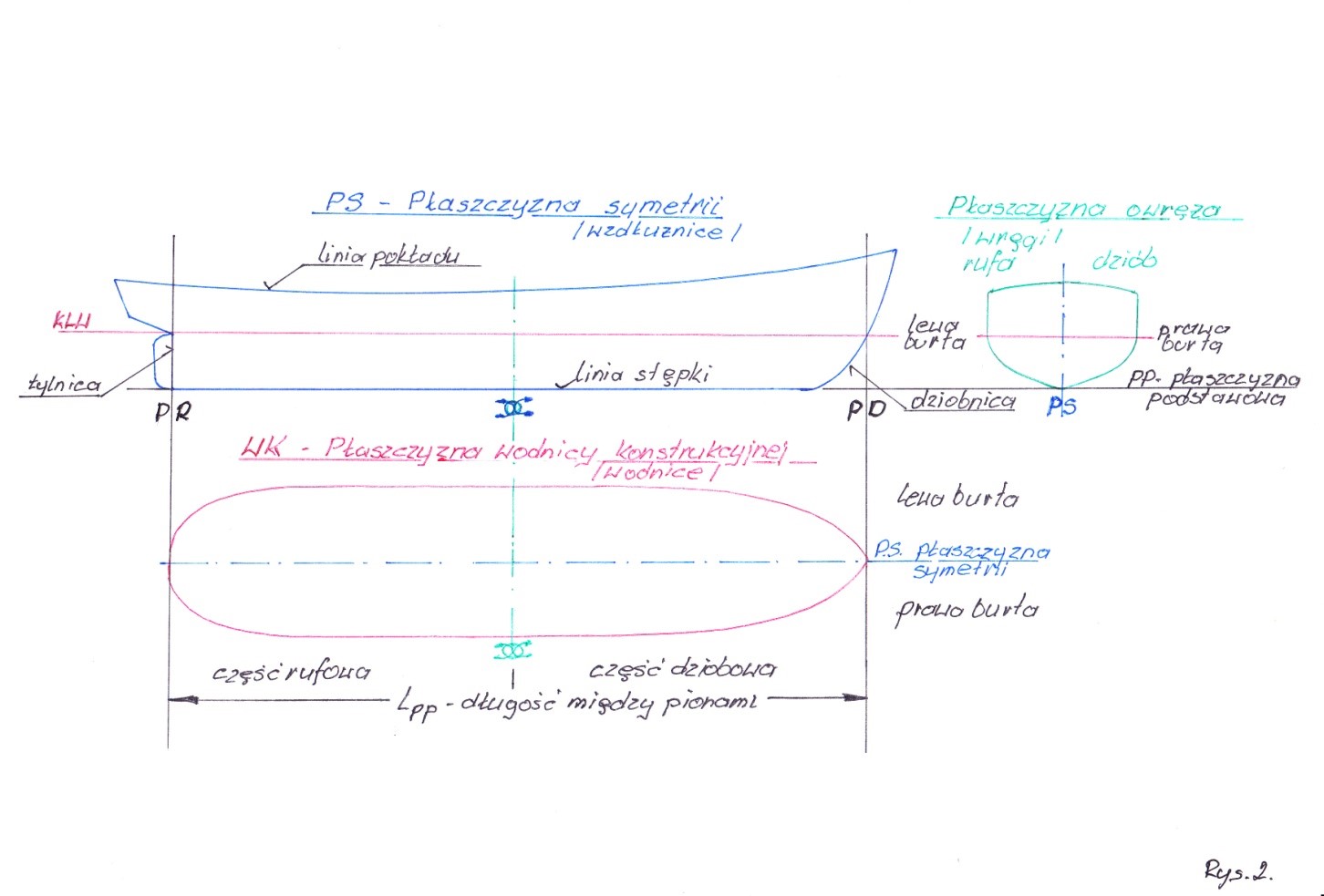 Poniżej podano zasady wymiarowania statku i określenia używane przy projektowaniu i czytaniu linii teoretycznych.