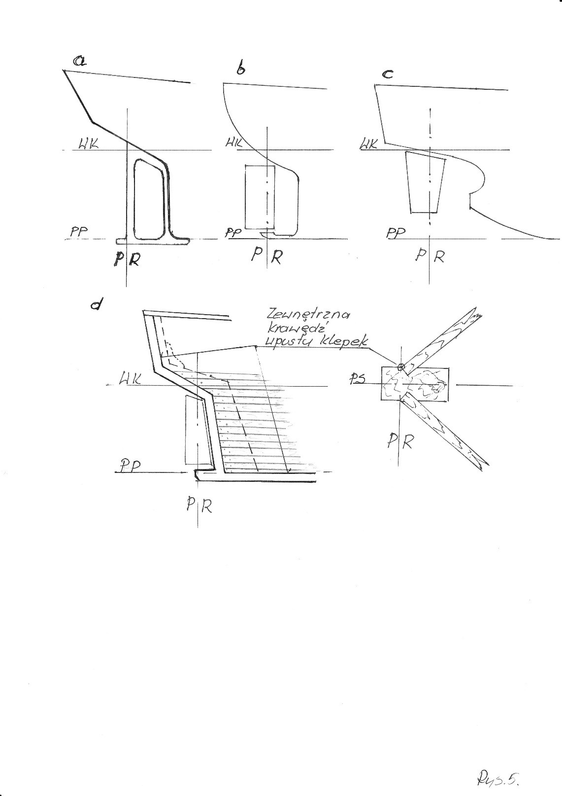 - w statkach drewnianych przez punkt przejścia zewnętrznej krawędzi klepek poszycia do tylnicy na wysokości wodnicy konstrukcyjnej WK ( rys.5 d)