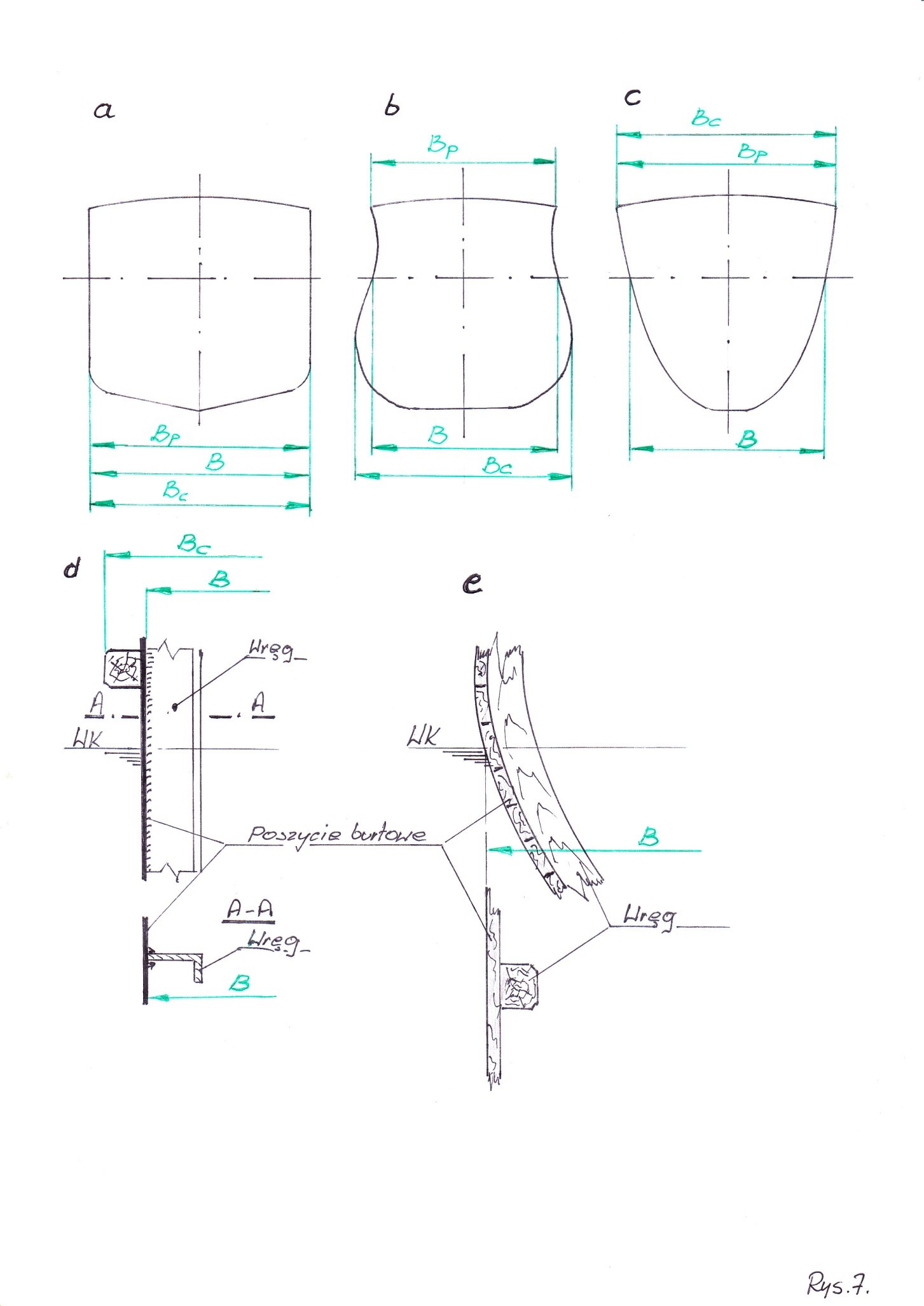 - dla kadłuba drewnianego i z tworzyw sztucznych uwzględniamy poszycie i rozpatrywać będziemy zewnętrzną powierzchnię kadłuba, czyli linie teoretyczne przebiegają po zewnętrznej krawędzi poszycia.