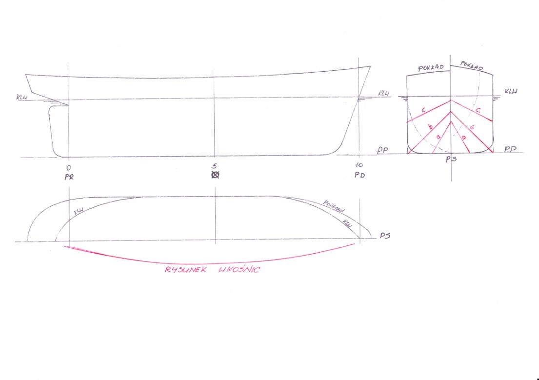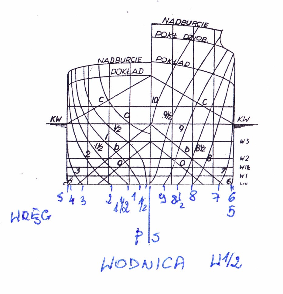 Wszystkie linie krzywe na rysunku teoretycznym ze względu na symetryczność kadłuba rysujemy dla połowy statku. Jedyny wyjątek stanowi wręg 5 ( przy podziale LPP na 10 wręgów teoretycznych ) lub 10 ( przy podziale LPP na 20 wręgów teoretycznych ) na rzucie poprzecznym, owrężenia który rysujemy w całości . Pozostałe wręgi rysujemy po połowie zachowując zasadę , że wręgi od strony rufy czyli od 0 do 5 lub 10 rysujemy po lewej stronie rzutu poprzecznego, natomiast wręgi od owrężenia do dziobu czyli od 5lub 10 do 10 lub 20 ( w zależności od przyjętego podziału) rysujemy po prawej stronie rzutu poprzecznego. Krzywe na poszczególnych rzutach opisujemy odpowiednimi dla nich oznaczeniami . Zasadę numerowania podałem we wcześniejszych rozdziałach. Krzywe muszą mieć przebieg płynny i muszą być wzajemnie uzgodnione. W tym celu sprawdzamy współrzędne punktów przecięcia się krzywych na poszczególnych rzutach rysunku teoretycznego linii kadłuba. Dokładność wykonania siatki i linii powinna sięgać 0,1 mm .