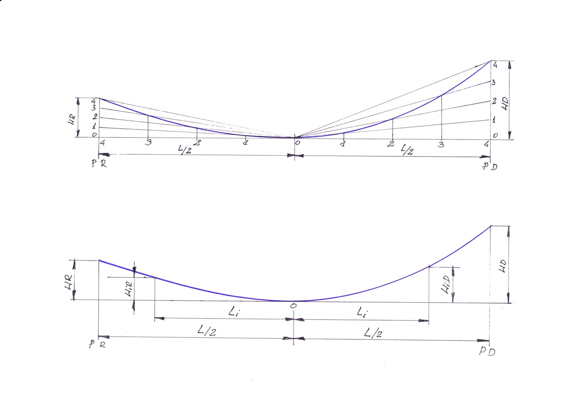 Na pionie dziobowym rysujemy ćwiartkę łuku koła o promieniu r = WD. Okrąg dzielimy na 4, 5,6, równych części ( w zależności od tego jaka dokładność krzywej chcemy uzyskać). Na tyle samo odcinków dzielimy L/2 długości między pionami . Przenosimy punkty podziału koła na jego średnicę . Przez górny punkt wzniosu dziobowego i wzniosu rufowego prowadzimy prostą aż do przecięcia z linią podstawy. Otrzymamy punkt przecięcia O . Teraz łączymy punkty podziały okręgu z punktem O. W punktach przecięcia prostopadłych poprowadzonych punktów podziału podstawy otrzymujemy punkty przebiegu krzywej wzniosu pokładu. Dalej postępujemy zgodnie z rys. 7 .