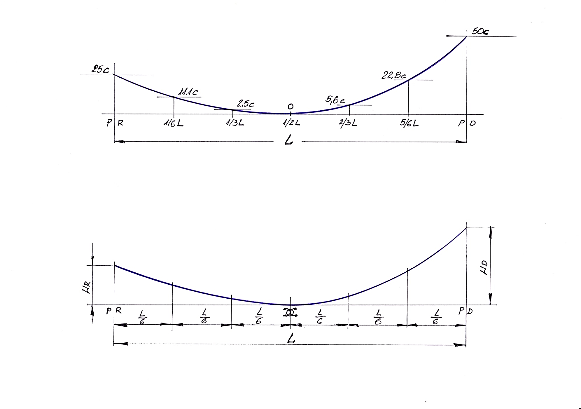 4. Punkty pośrednie wykonujemy wg poniższego schematu : dzielimy połowę długości L oraz WD i WR na jednakową ilość odcinków. Punkt 0 ( w połowie L) łączymy z punktami podziału WD i WR. Z punktów na odcinku L/2 wystawiamy prostopadłe. Przecięcia tych dwóch linii wyznaczają nam punktu krzywej wzniosu – rys.3.