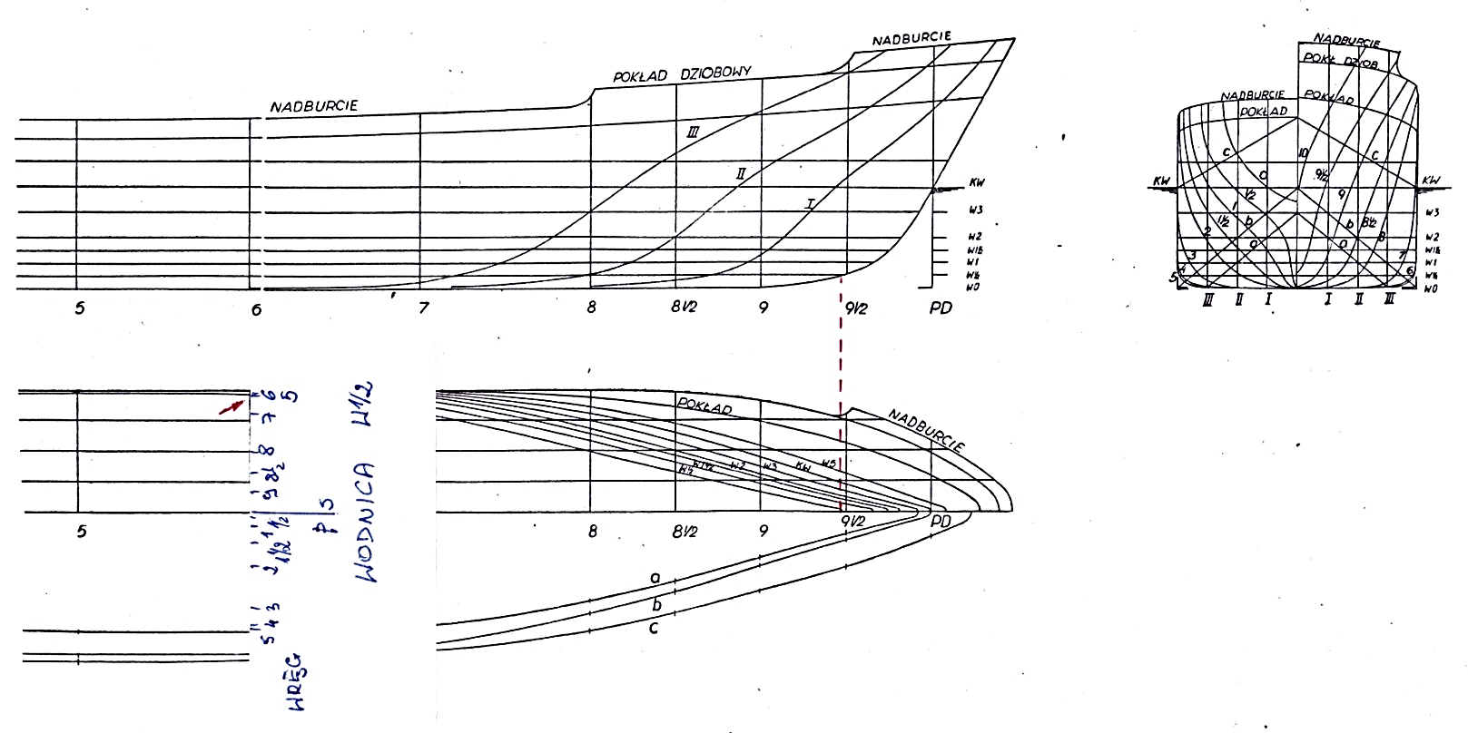 Mając wykreśloną sylwetkę statku i zarys pokładu na rzucie wzdłużnym, rysujemy owrężenie na rzucie poprzecznym, ale bez wypukłości pokładu. Aby nie zaciemniać rysunku, wypukłość pokładu dorysujemy na końcu o ile okaże się nam potrzebny.
