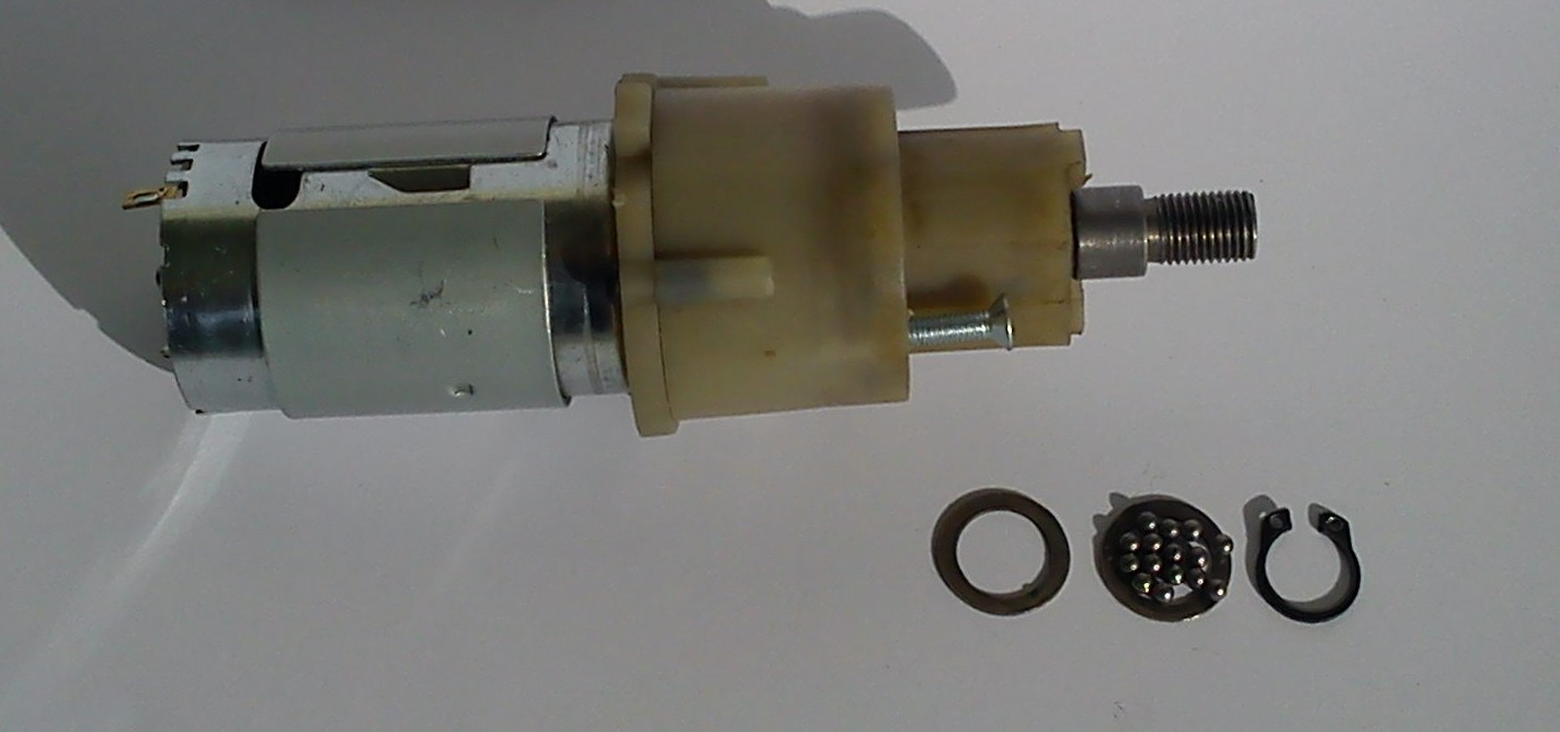 Jest to potrzebny nam gotowy motoreduktor . Rozbiurke zaczynamy od zdjęcia z wałka zabezpieczającego pierściena segera , za pomocą specjalnych szczypiec lub dwuch śrubokrętów . pod spodem są kulki łorzyska oporowego , będą potrzebne . Trzeba całość rozebrać ( trzy lub cztery wkręki na obwodże ) . Całość dokładnie myjemy . w benzynie lub nafcie .