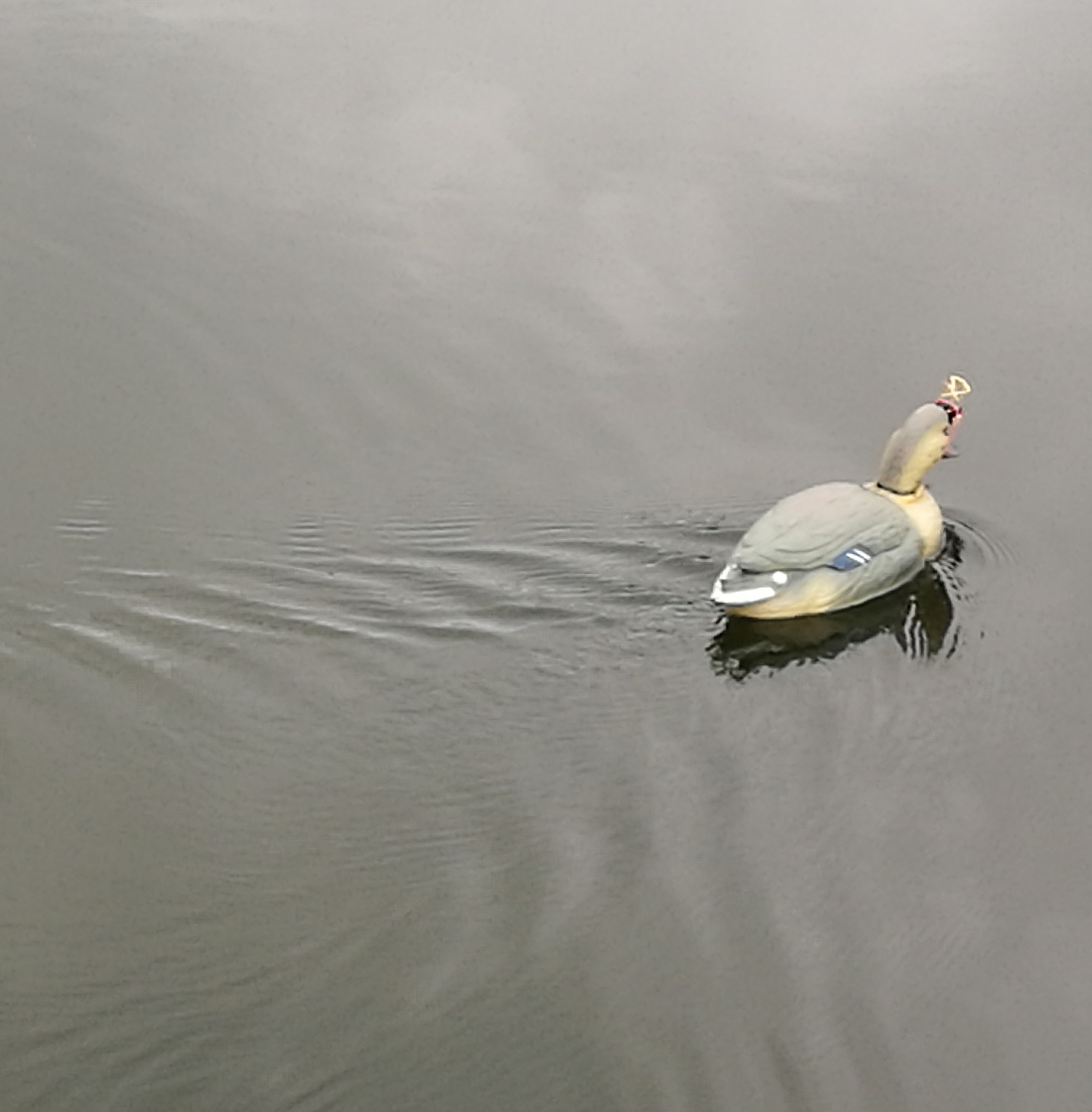 Kaczuszka jest dziełem naszego kolegi Andrzeja . Na głowie ma założoną kamerkę z nadajnikiem , podgląd i nagrywanie na telefonie . Dodatkowo poza pływaniem sterowany z aparatury ruch głowy , Żeby było ważne to " filma " będzie później , dzisiejsze nagrywanie wyszło do ... Ale mimo wszystko fajna zabawa .