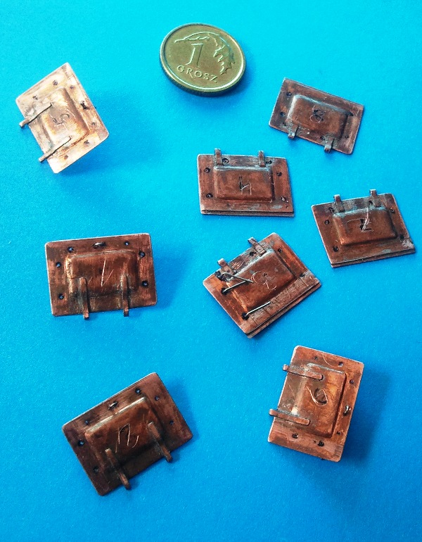 Do tej nadbudówki wykonałem z blaszki miedzianej 0,15 mm., pokrywy wlotów powietrza. Na zdjęciu w trakcie klejenia klamek i zaczepów, może się uda zrobić ruchome, zawiasy są