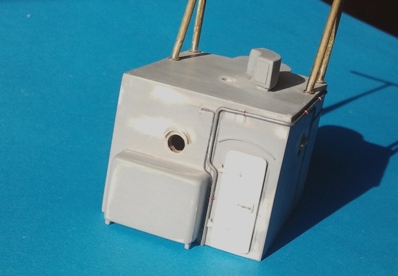 . Tym razem kolejne piętra nadbudówek. Wkleiłem na rufowej maszt antenowy i przymiarka podestu reflektora. Reflektory powoli powstają i podesty dalmierzy. Marku to właśnie te wentylatory, przy czym na zdjęciu są bez pokręteł.