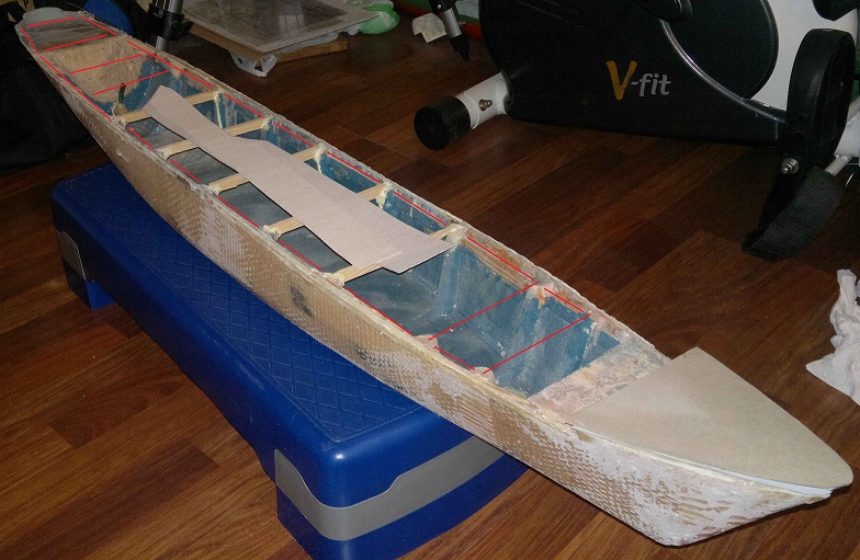 Jak dla mnie to masz gotowy kadłub... przede wszystkim dałbym jakieś listwy na burty które stworzą podstawę pod pokład oraz wyrównają Ci krawędzie burt... Czerwone kreski to sugerowane listwy... kiedy dokleisz je stworzysz sobie nie jako szkielet który będzie stanowił punkt odniesienia do wyprostowania tego wszystkiego... jak dasz listwy to oprzyj na nich pokład albo ramę w kształcie pokładu (mniej więcej to samo co ja zrobiłem z tankowcem)... jak będziesz mieć taką ramę to przyklej ją do stworzonego szkieletu... najpierw upewnij się że rama pasuje idealnie przyklej ją... a wszystkie dziury między ramą a burtą zaszpachluj... lub zalaminuj (wedle uznania) wtedy stworzysz sobie coś do czego łatwiej będzie ci się odnieść... wtedy zrób dopiero nadburcia... najpierw zrób podpory nadburć a dopiero później doklejaj nadburcia... ja tak zrobiłem i jakoś wyszło :)
