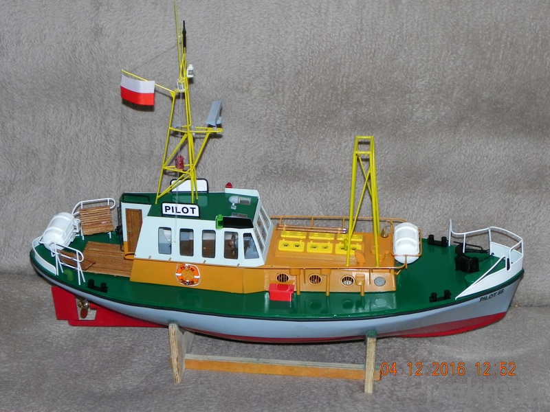 Gotowy? NIe. Jeszcze nie. Teraz widać, że lampa rufowa jest za nisko. Błąd na rysunku kosza. Na planie ogólnym jest wspornik lampy wyżej. Brakuje drabinek przy przednim maszcie, olinowanie masztu i flagi. Drobne poprawki. Co więcej okaże się na wodzie.