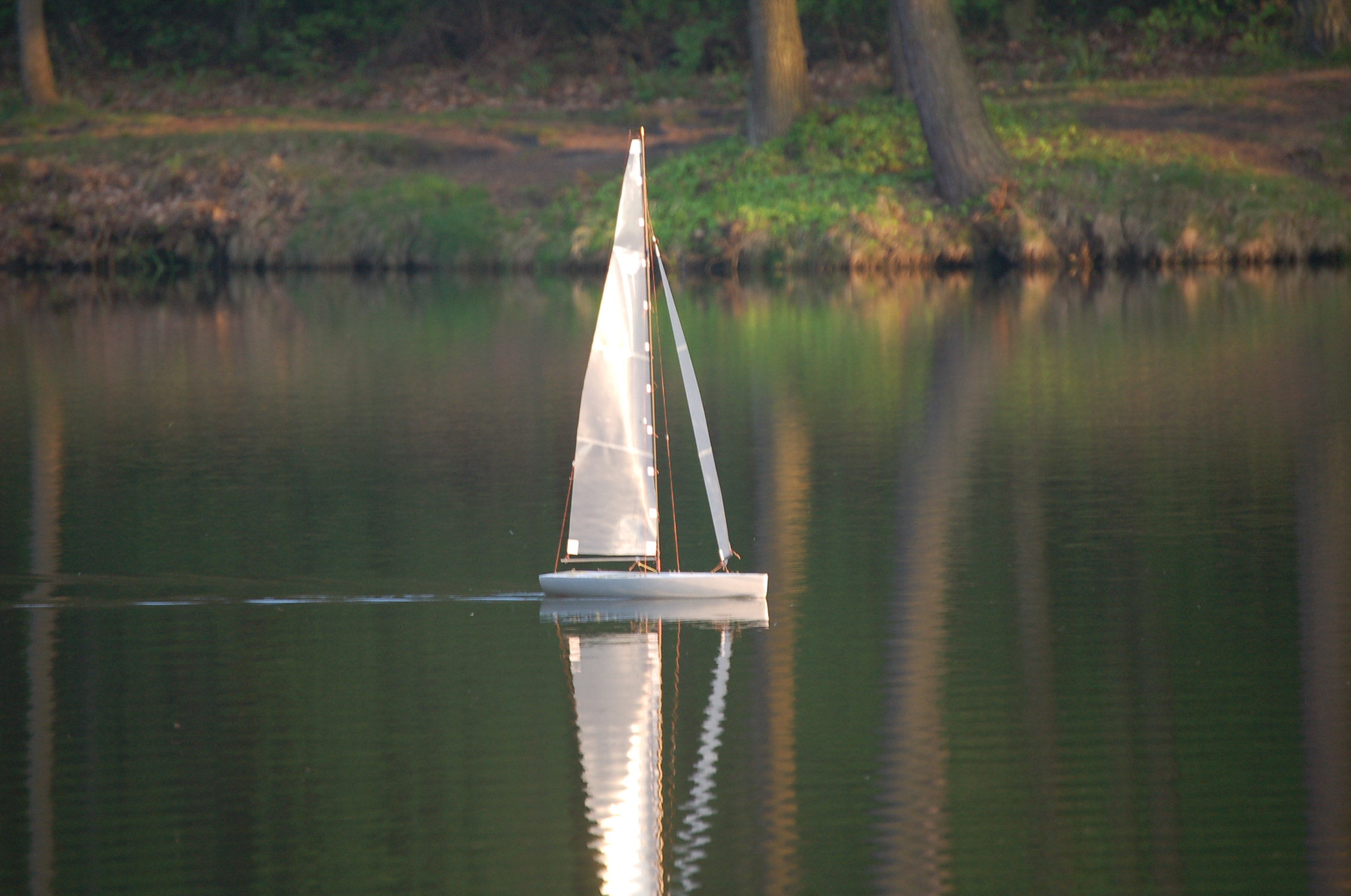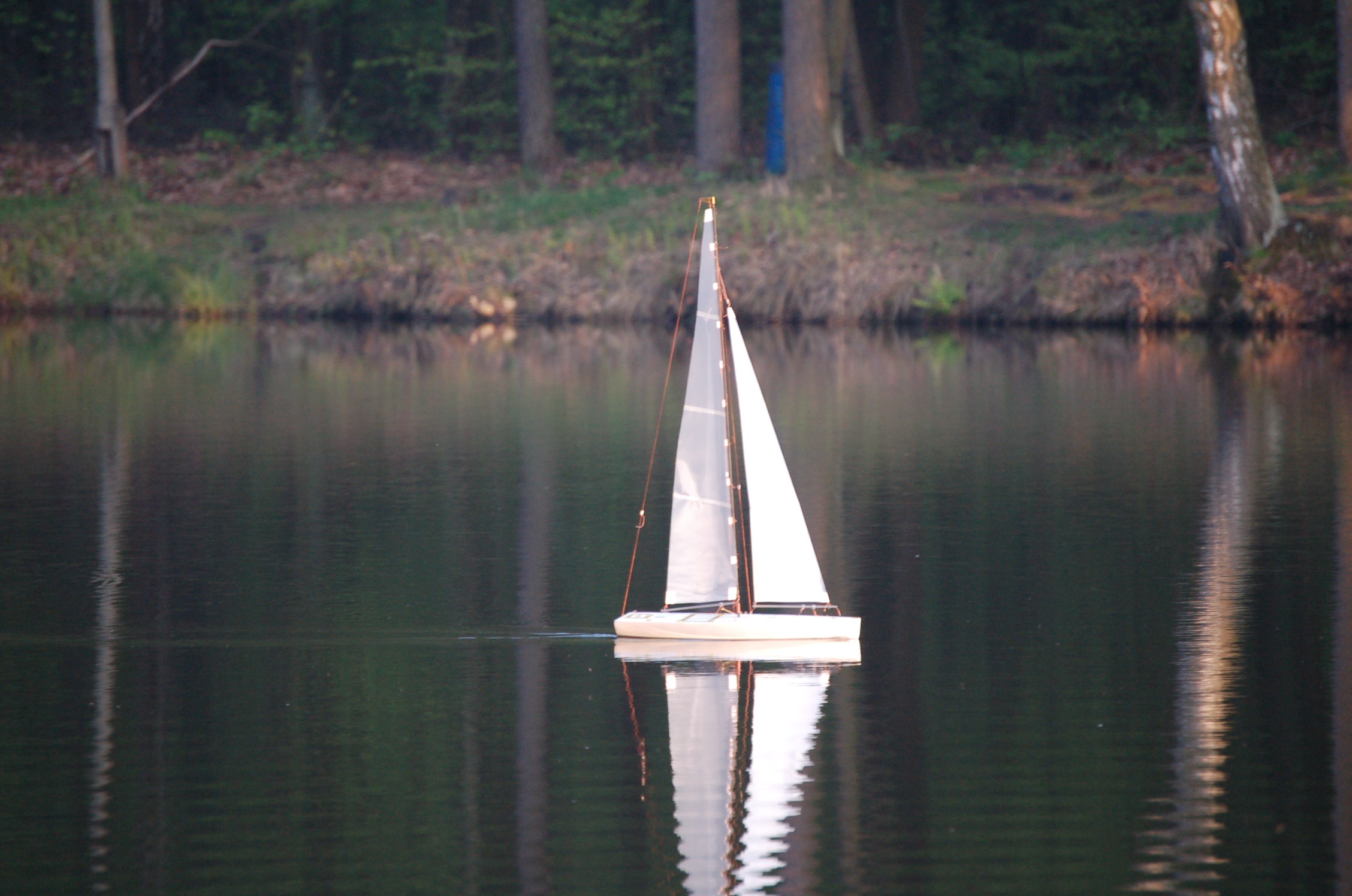 Łódka została wstępnie ukończona i opuściła modelarnię. Pozostało przyciąć odrobinę żagle, wyregulować wszystko i zwodować.