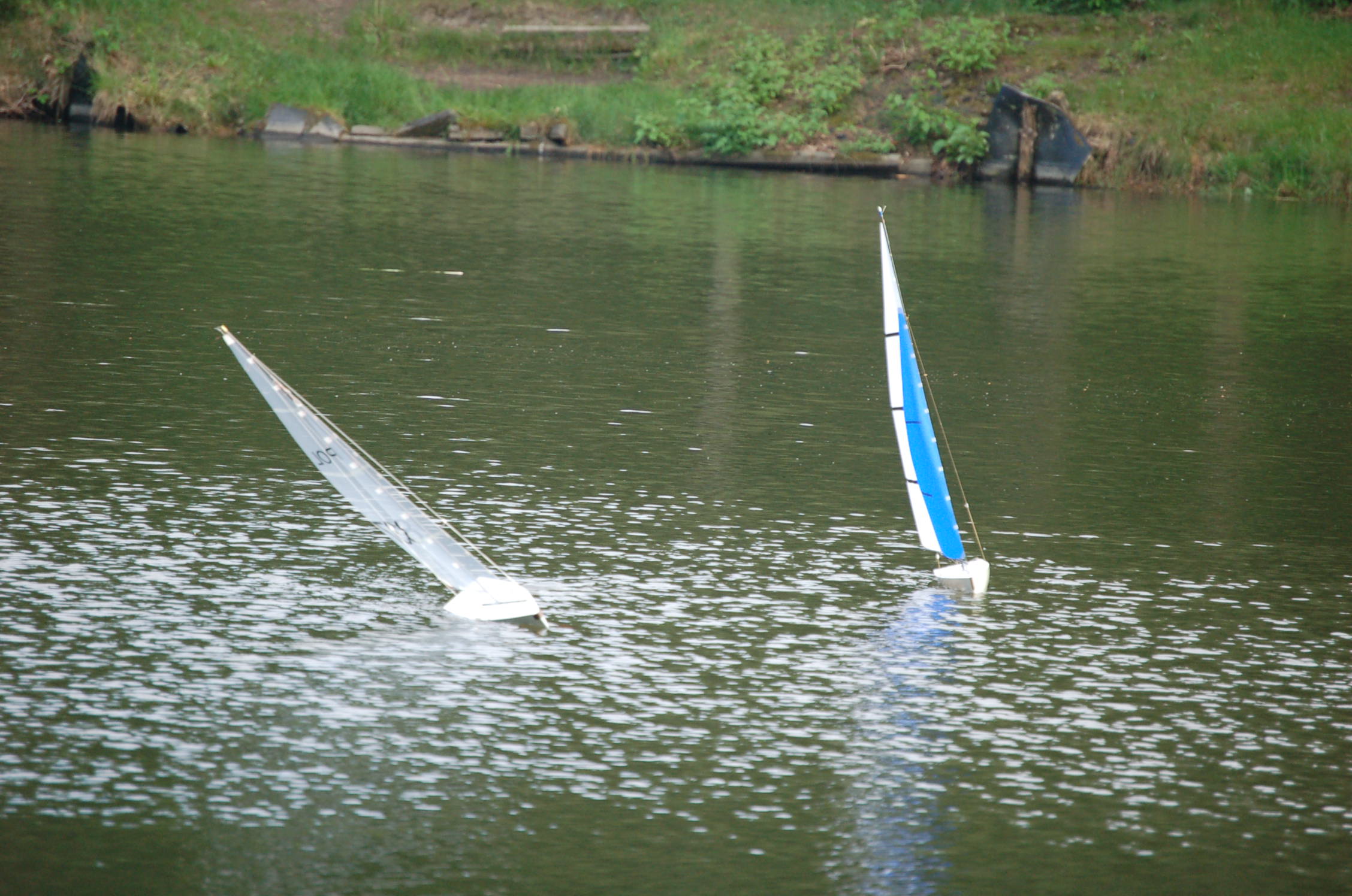 Dzisiaj testowałem zmiany w łódce. Modyfikacje z ostatniego postu poprawiły zachowanie jachtu na wodzie. Po pierwszym pływaniu (za radą kolegi) maszt został przestawiony maksymalnie do tyłu i był to strzał w dziesiątkę. Zresztą pływanie w dwa jachty jest znacznie fajniejsze co pokazują zdjęcia.