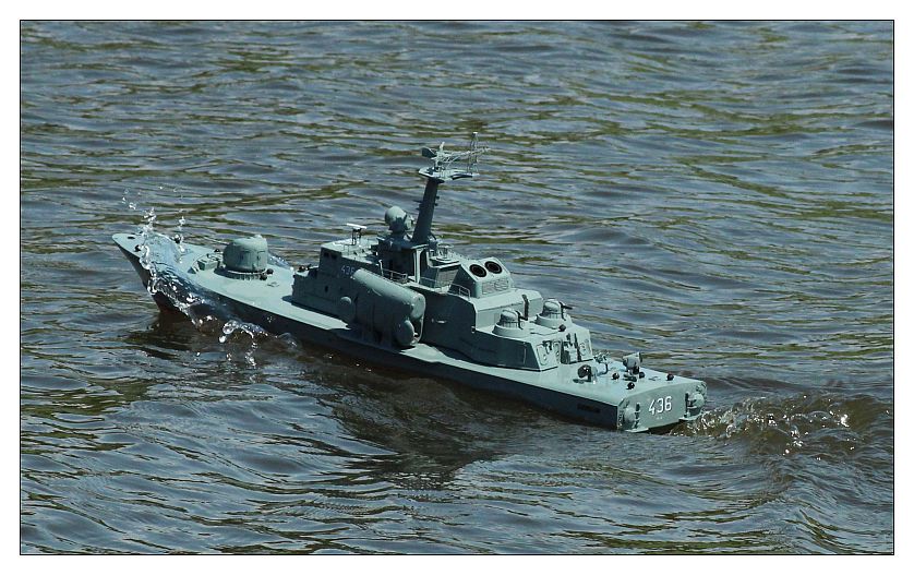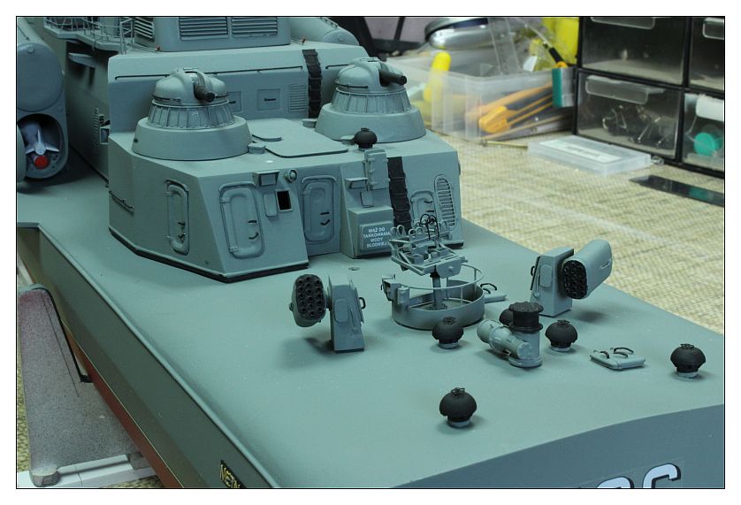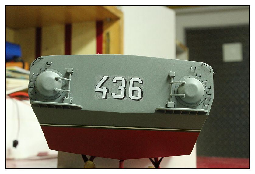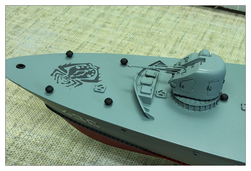 Metalowiec nabiera kształtów. Drutologia imponująca i po położeniu farby na pewno będzie robić wrażenie. Jedyne co mi się nie podoba to film na kalkomanii z numerem na rufie. Kalka ewidentnie położona na nieodpowiednio przygotowaną powierzchnię. Zerwij ją i spróbuj jeszcze raz ale najpierw przygotuj powierzchnie jakimś mocno błyszczącym lakierem (może być sidolux do pcv), potem zastosuj płyn pod kalki np. DecalSET (poprawia przyleganie kalki i usuwa bąble powietrza), potem na kalkę płyn DecalSOL, który zmiękcza, naciąga i zapobiega błyszczeniu. To wszystko traktujesz jeszcze raz lakierem błyszczącym na zabezpieczenie (już jakimś wodoodpornym jeśli model ma pływać) i ewentualnie półmatem, zależnie jaką chcesz mieć powłokę na koniec. Może brzmi to skomplikowanie i jest trochę pracochłonne ale uwierz mi przerabiałem to w Piorunie i Groźnym i warto!