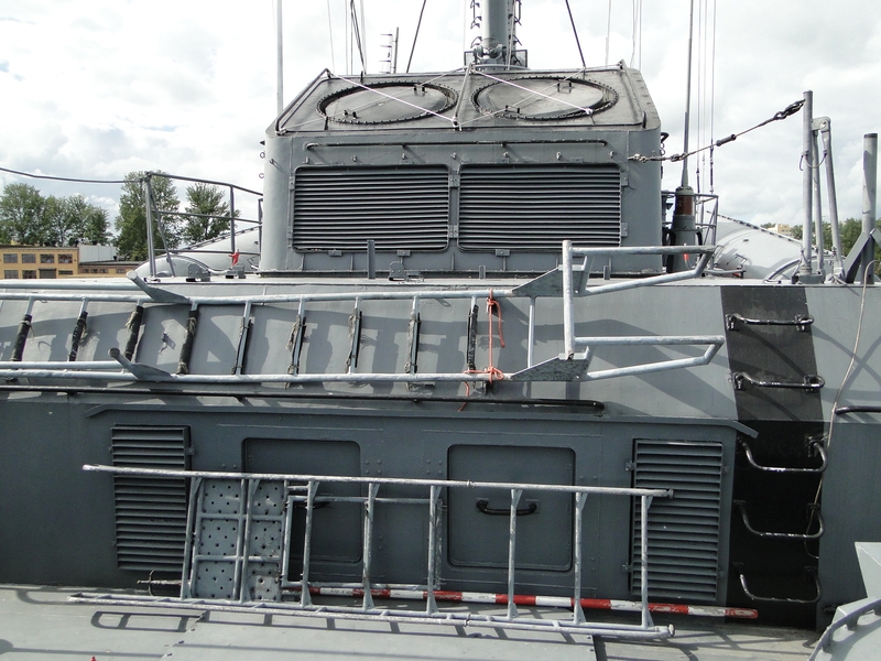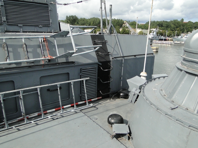 Ta górna drabinka, dłuższa - na burtę, np. do podbierania ludzi z wody a ta dolna do dostępu do hangarów wyrzutni.
