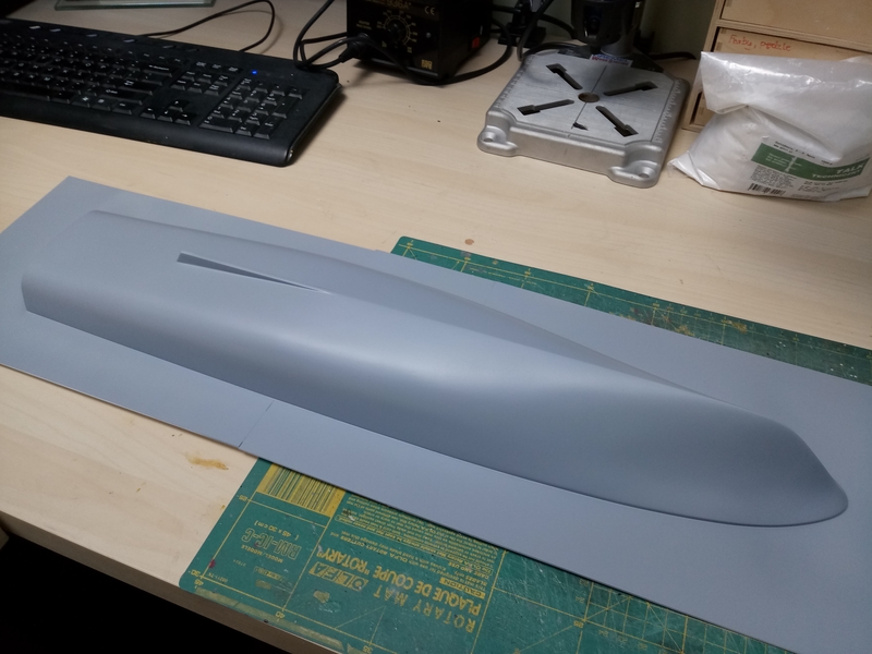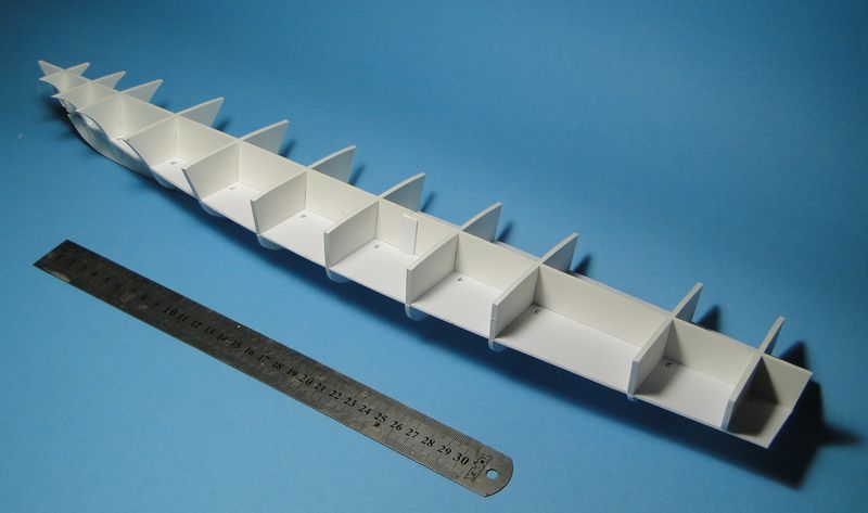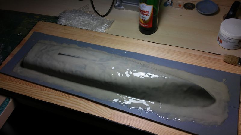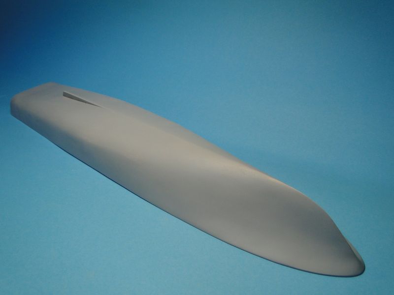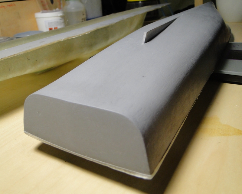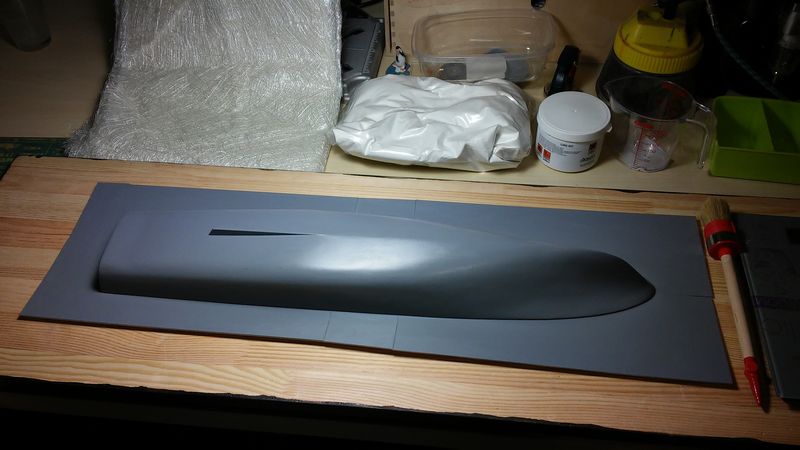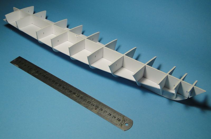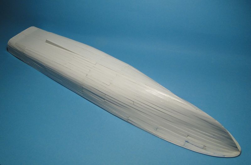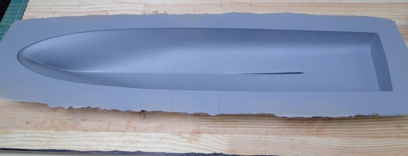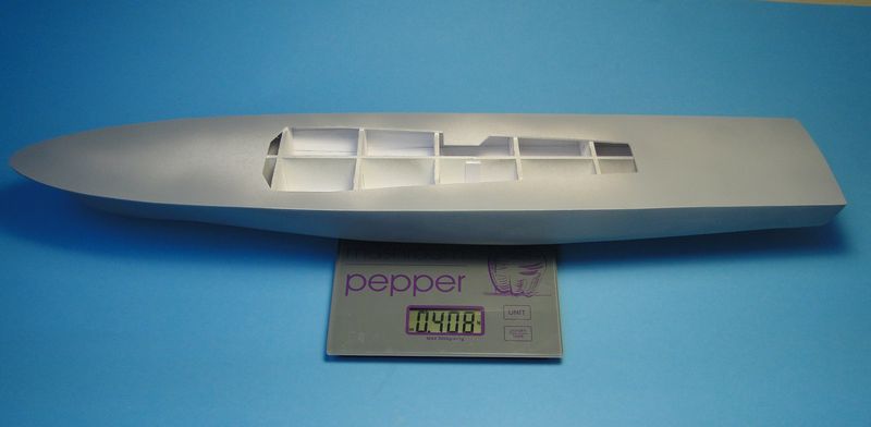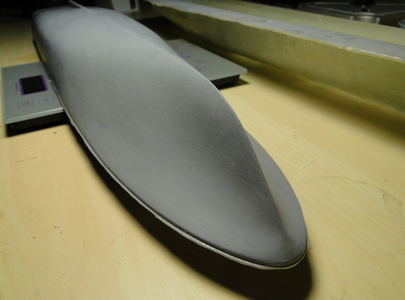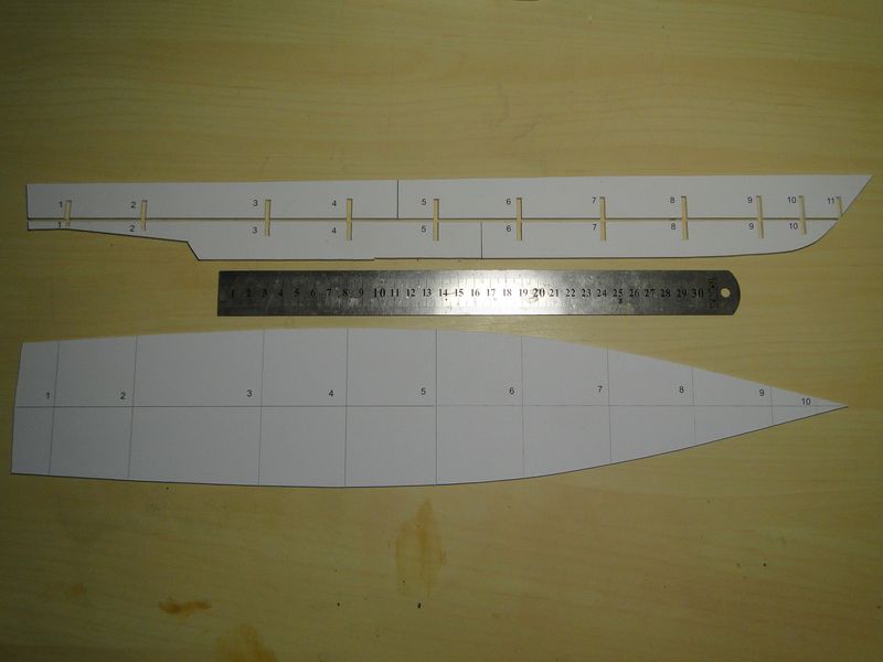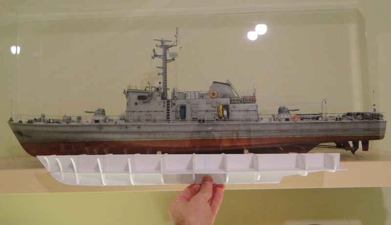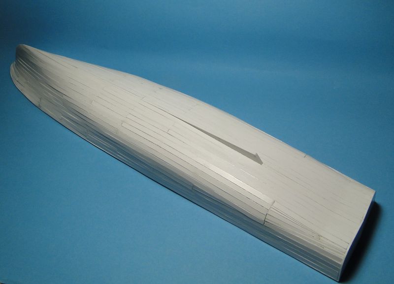 Model, jak poprzednie, powstaje w skali 1:50 i z tego powodu będzie stanowić dla mnie nie lada wyzwanie. Piorun wypierał 3 kg, Groźny 2 kg a kuter, wg obliczeń, tylko 700 g. Właśnie z powodu masy odpada metoda słomkowa stąd zamierzam zbudować swój pierwszy kadłub z laminatu. W tym celu zbuduję kopyto, na podstawie którego następnie wykonam formę i kadłub docelowy.