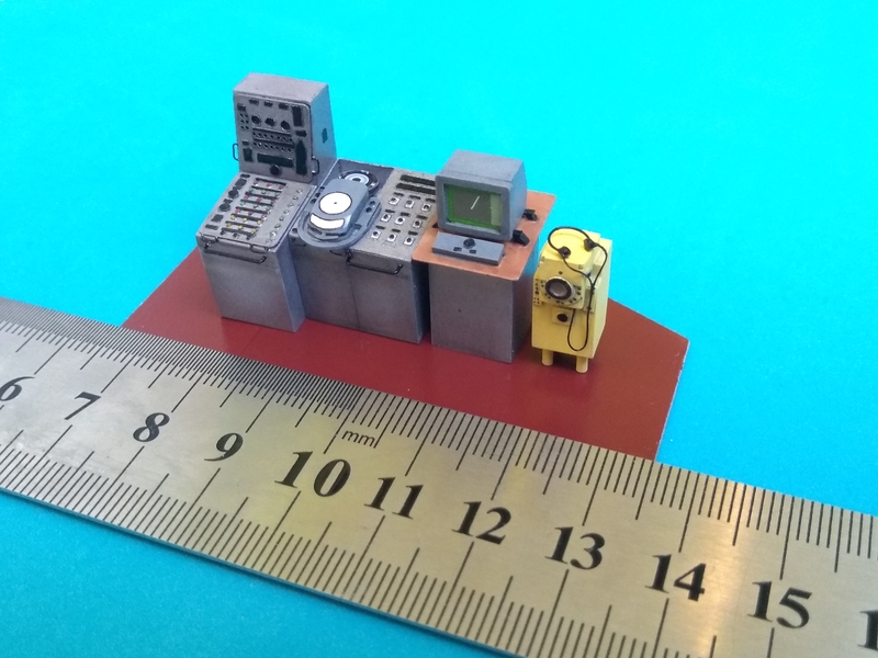 Od lewej: pulpit elektryka, telemanipulator steru+repetytor żyro, pulpit mechanika, wskaźnik radaru nawigacyjnego i wskaźnik stacji hydrolokacyjnej MG-329M.