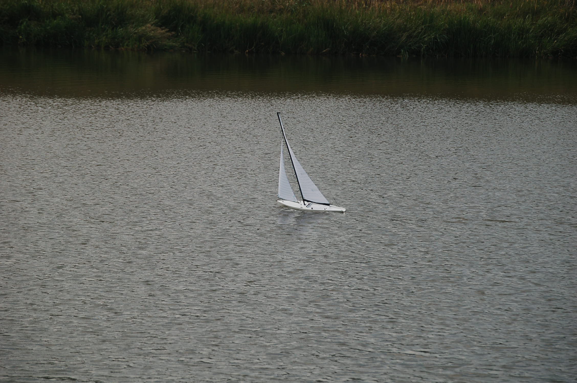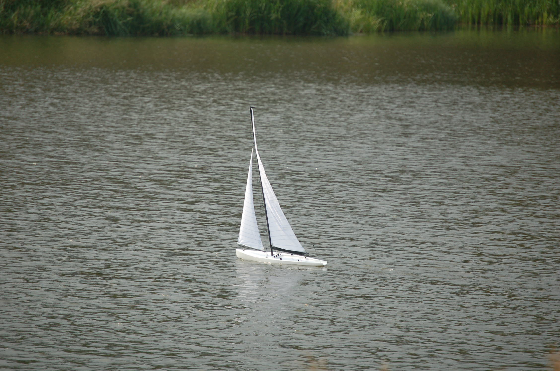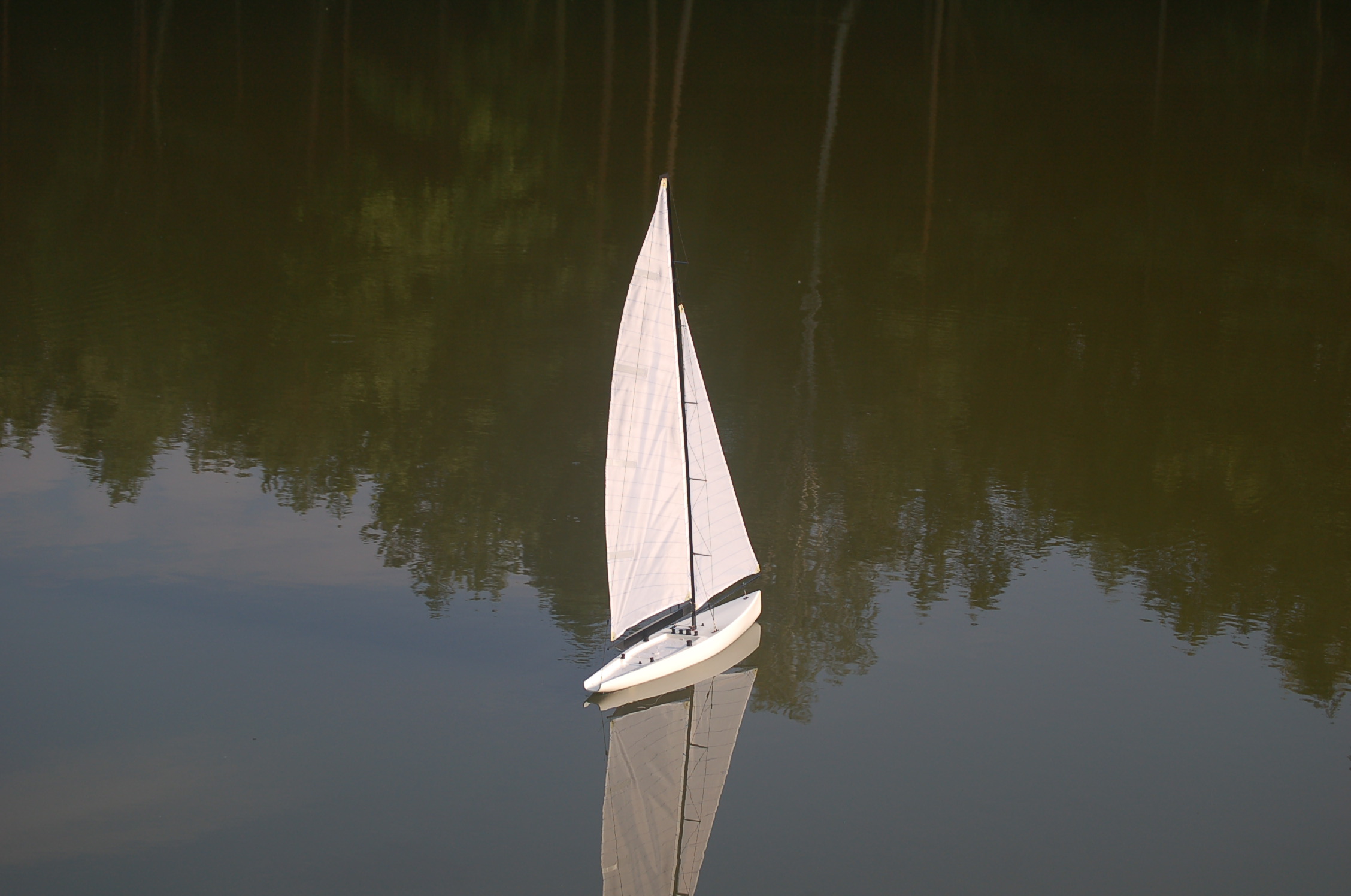 . Pomimo to jestem zadowolony, bo przy bardzo słabym wietrze i "zestawowych" żaglach, łódka ładnie reagowała na ster i pływała.