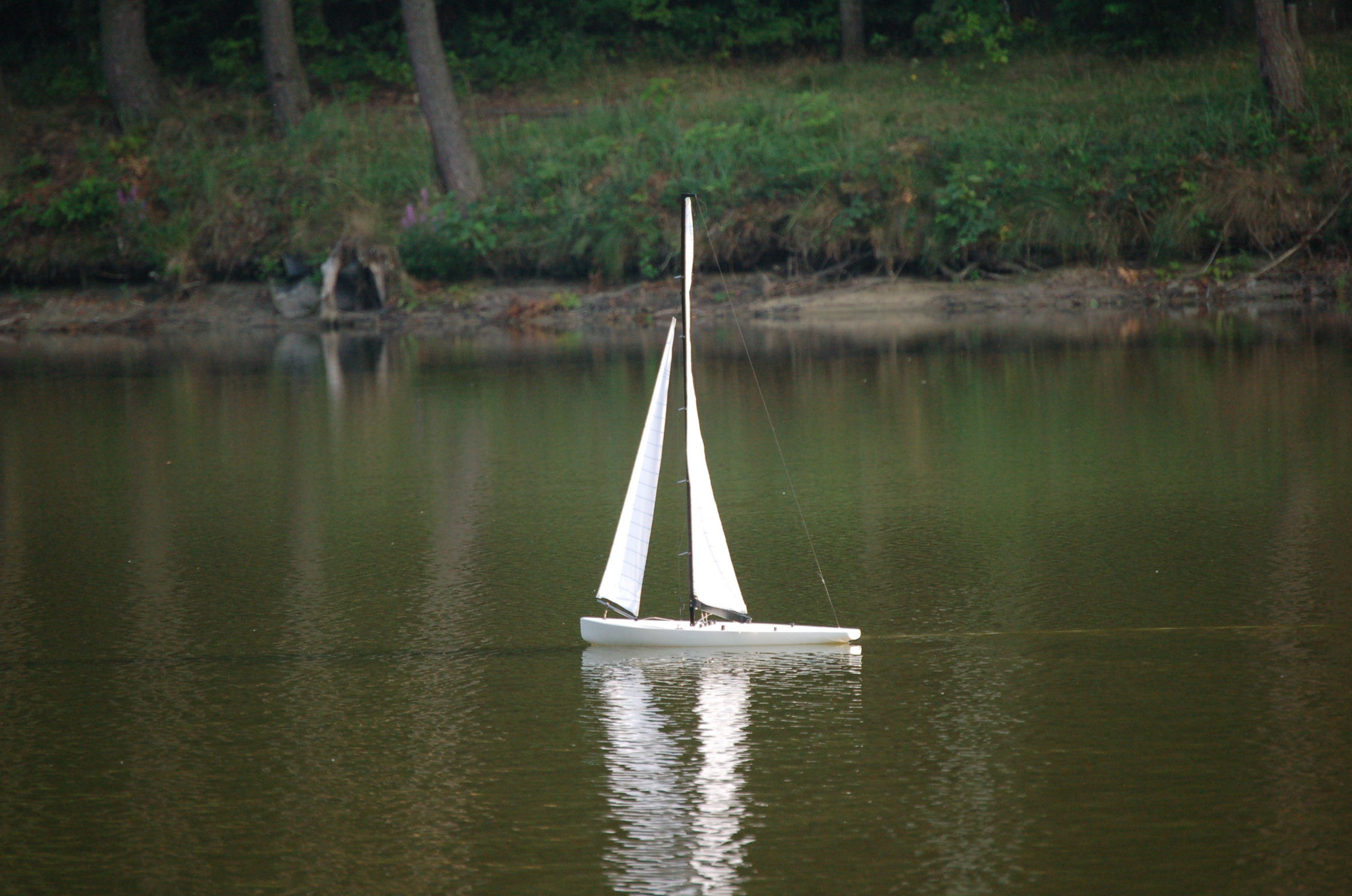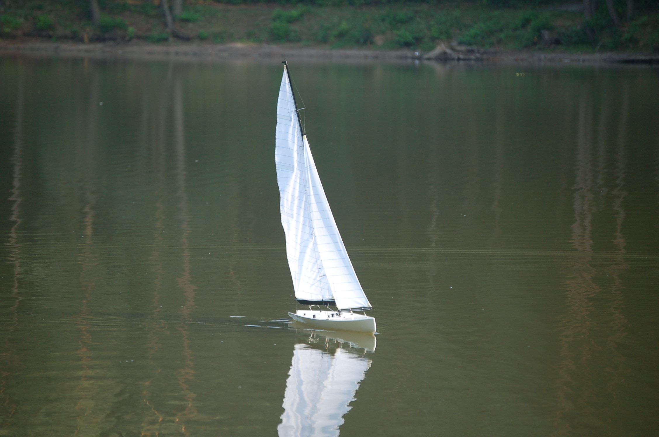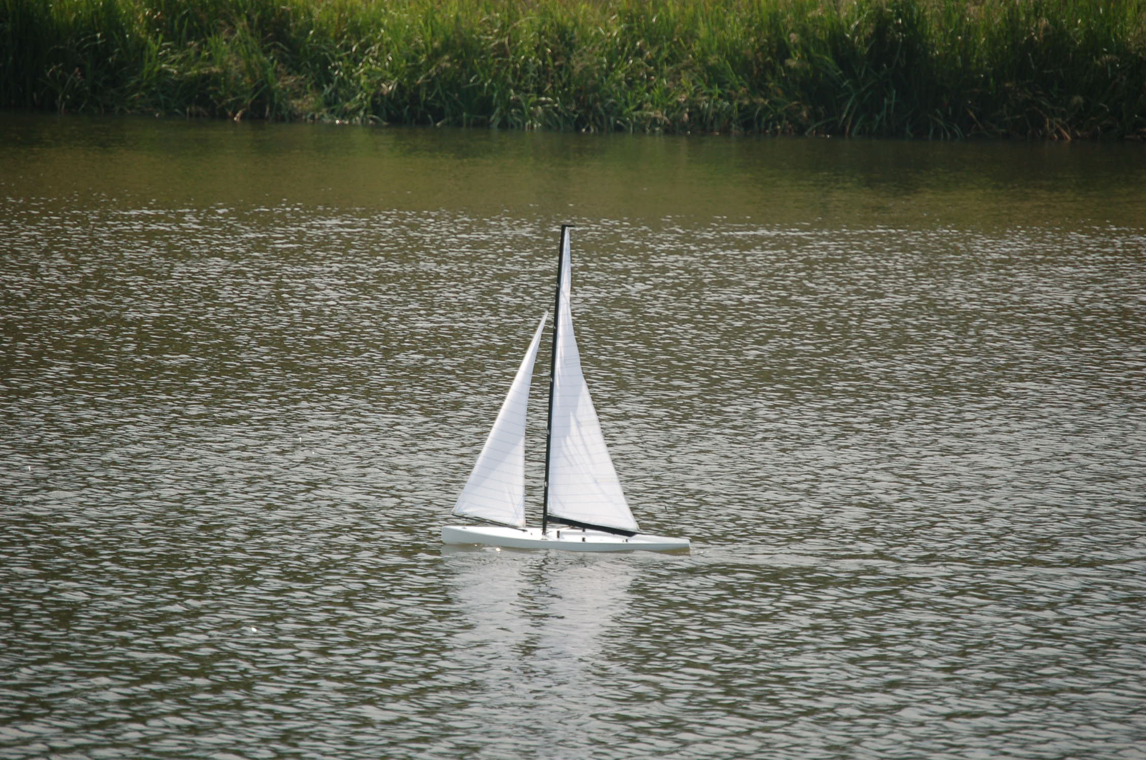 . Pomimo to jestem zadowolony, bo przy bardzo słabym wietrze i "zestawowych" żaglach, łódka ładnie reagowała na ster i pływała.