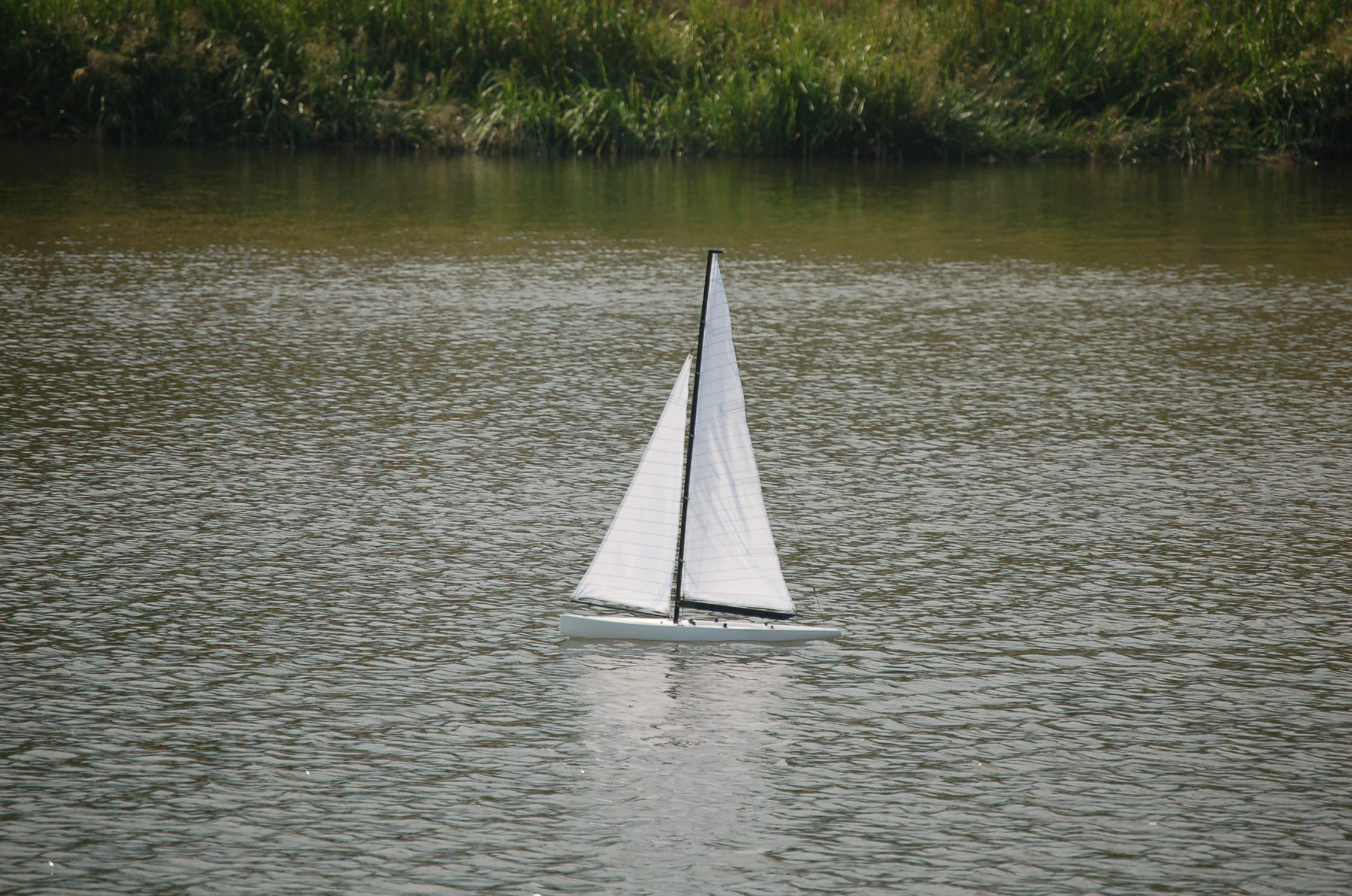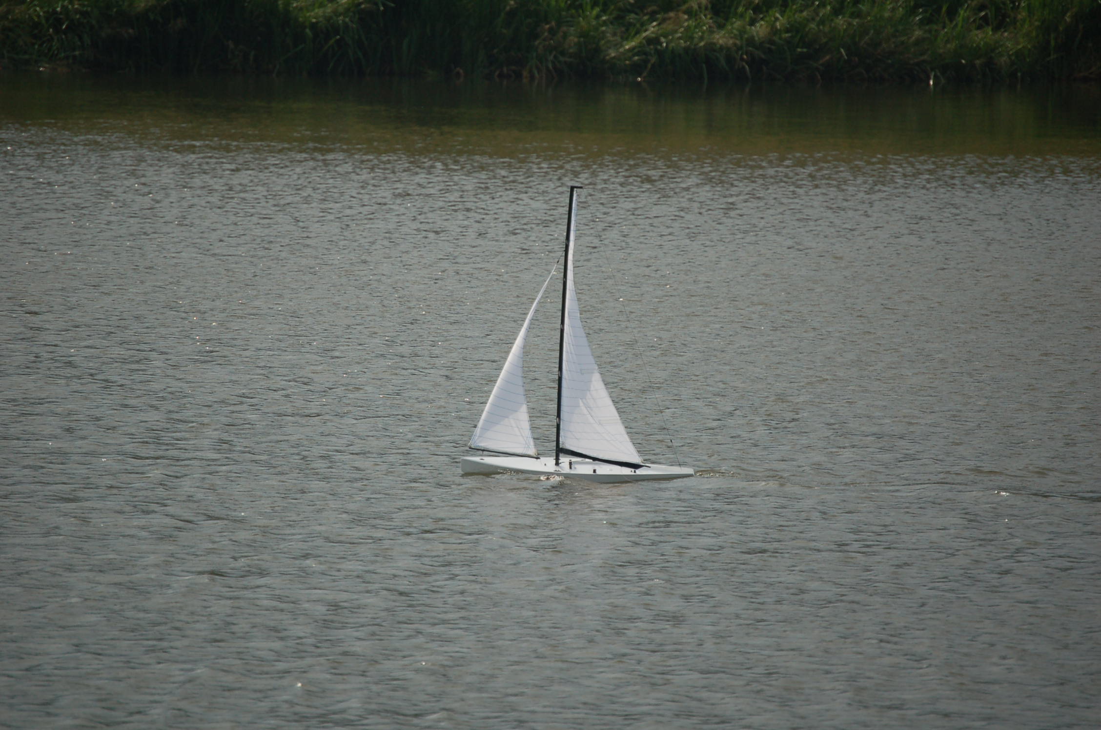 . Pomimo to jestem zadowolony, bo przy bardzo słabym wietrze i "zestawowych" żaglach, łódka ładnie reagowała na ster i pływała.