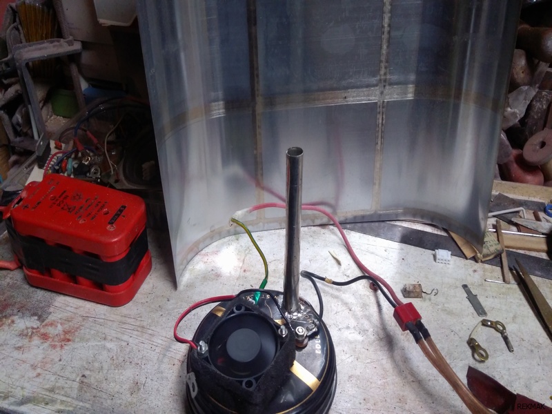 Wytwornica dymu. Są różne rozwiązania i jedno z nich wypatrzyłem w internecie. Jako grzałka rezystor ceramiczny 5 ohm 10 W. Były dwa, zastosowałem jeden. Końce zaokrąglone, skręcone są razem z końcówkami przewodów wkrętami i przez pokrywę pudełka z tulejkami izolującymi. Pudełko typu pasta do butów ale większe znalazłem w rupieciach. W pokrywie po wycięciu otworów przykręciłem mały wiatraczek komputerowy. Przylutowałem także rurkę około fi 10 mm . Najpierw była krótka ale dym się rozpraszał w grubym kominie więc wydłużyłem prawie do samego wylotu komina. Rezystor owinąłem knotem do lamp naftowych i szczepiłem drutem. Koniec zanurzony w płynie. Płyn można kupić (trochę drogi), można kombinować różne mieszanki, ropa, gliceryna. Zasilanie. Zastosowałem li-on 4 sztuki aby było wyższe napięcie. Złącze typu DEAN, załączam na brzegu i jak się nagrzeje wytwornica, stawiam model na wodę.
