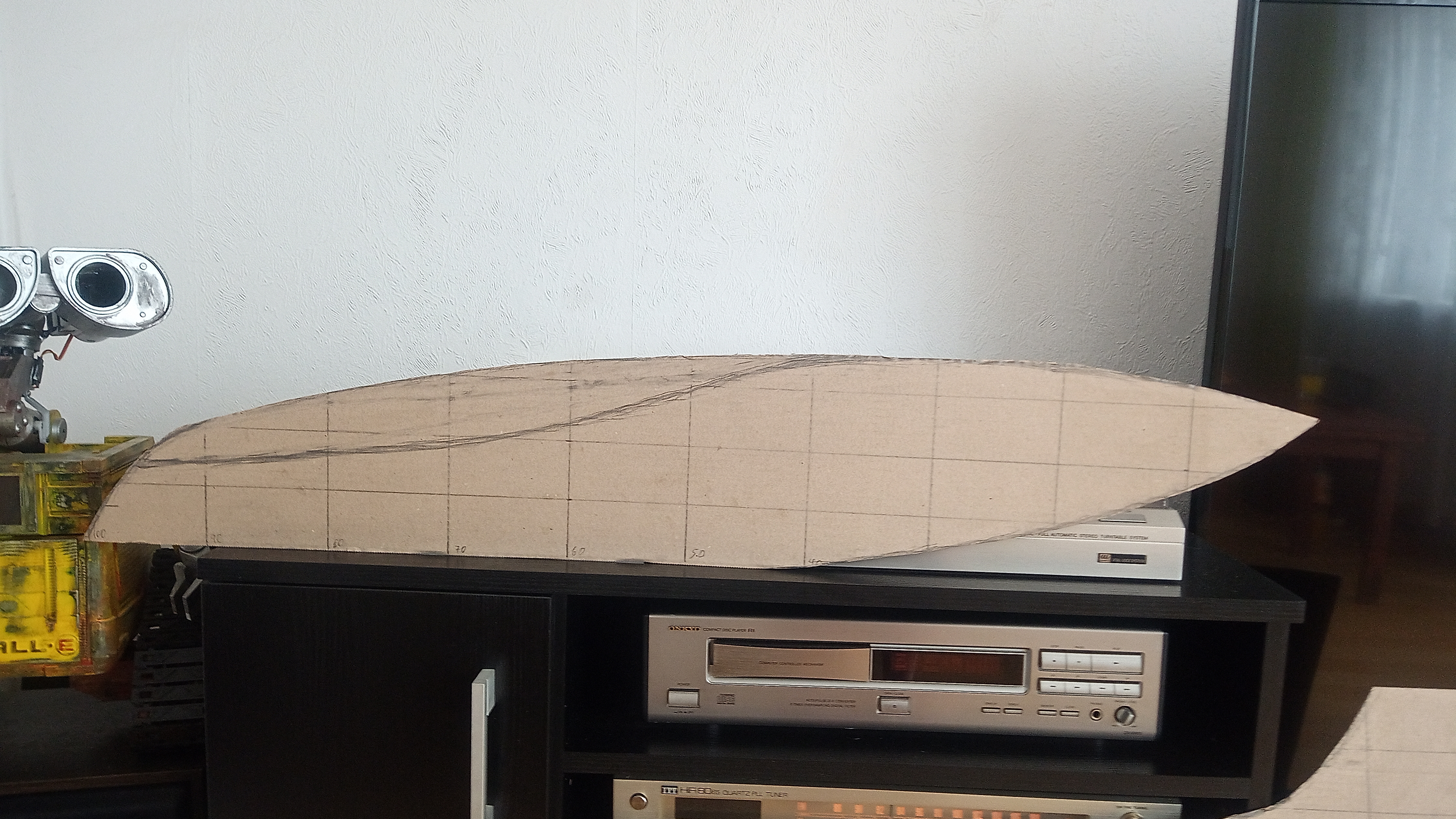 Model będzie wykonany z drewna, długość kadłuba 100cm, szerokość w najszerszym miejscu 33cm, wysokość w najwyższym miejscu 18cm.