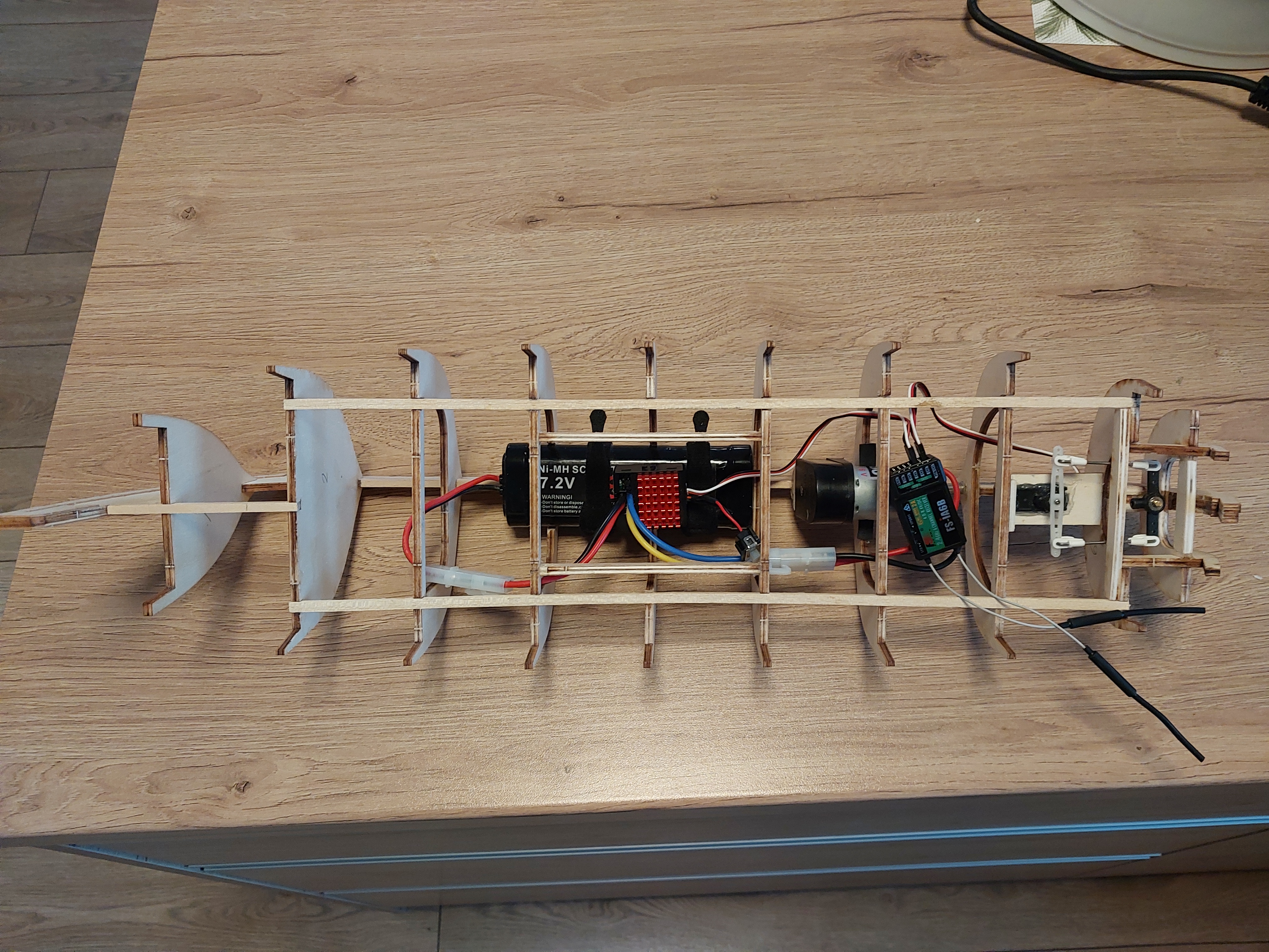 Witam przy budowie kutra poczyniłem pewne postępy. Szkielet jest już zmontowany na tym etapie wstępnie montuje wyposażenie RC jako, iż model nie posiadał "fabrycznego" przystosowania do tego celu a kadłub jest dość mały to w tej chwili łatwej mi wprowadzać konieczne modyfikacje w szkielecie. Zastosowane napęd to silnik 40o wraz z przekładnią 3:1 graupner.