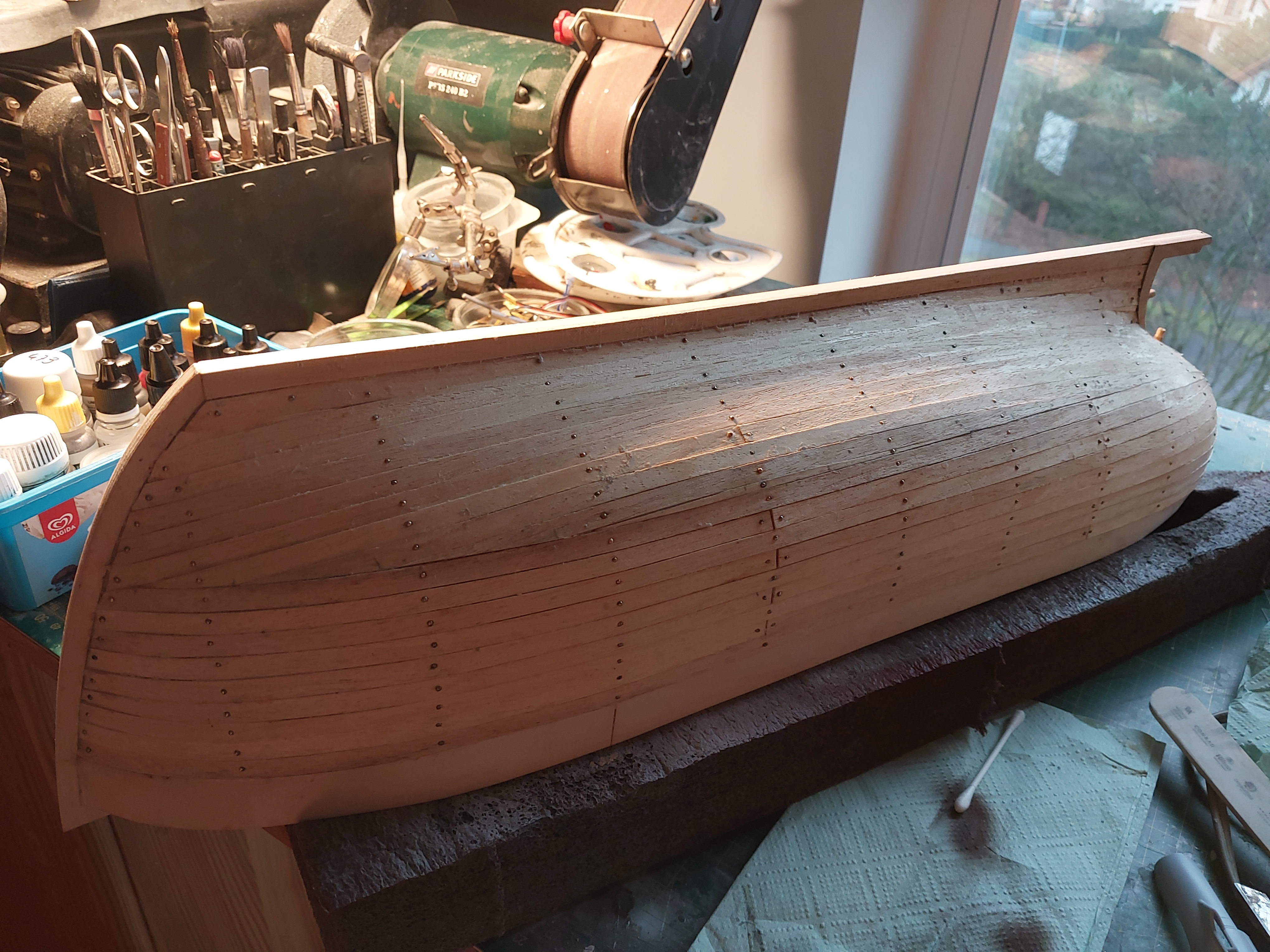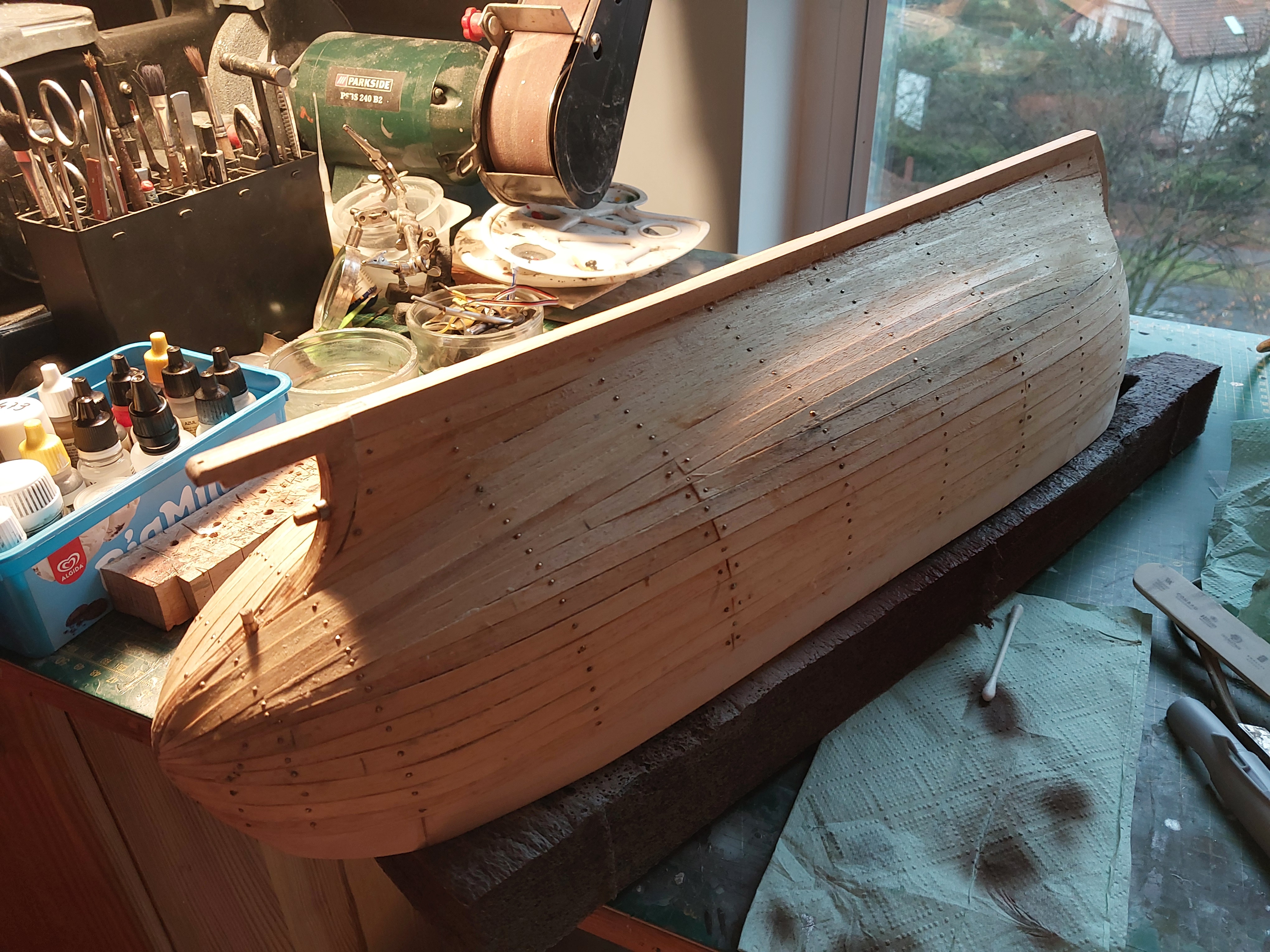 Prace przy kutrze idą powoli do przodu. Trochę opornie bo dodatkowo ciągnę jeszcze jeden projekt poboczny (wszystkie samoloty na których latał mój dziadek w 1/72 a jest tego 24 typy więc też trochę to mnie pochłania). Ale jak widać na zdjęciach poszycie z listewek jest już zrobione, teraz trzeba wyciągnąć gwoździe przeszlifować i zalaminować.
