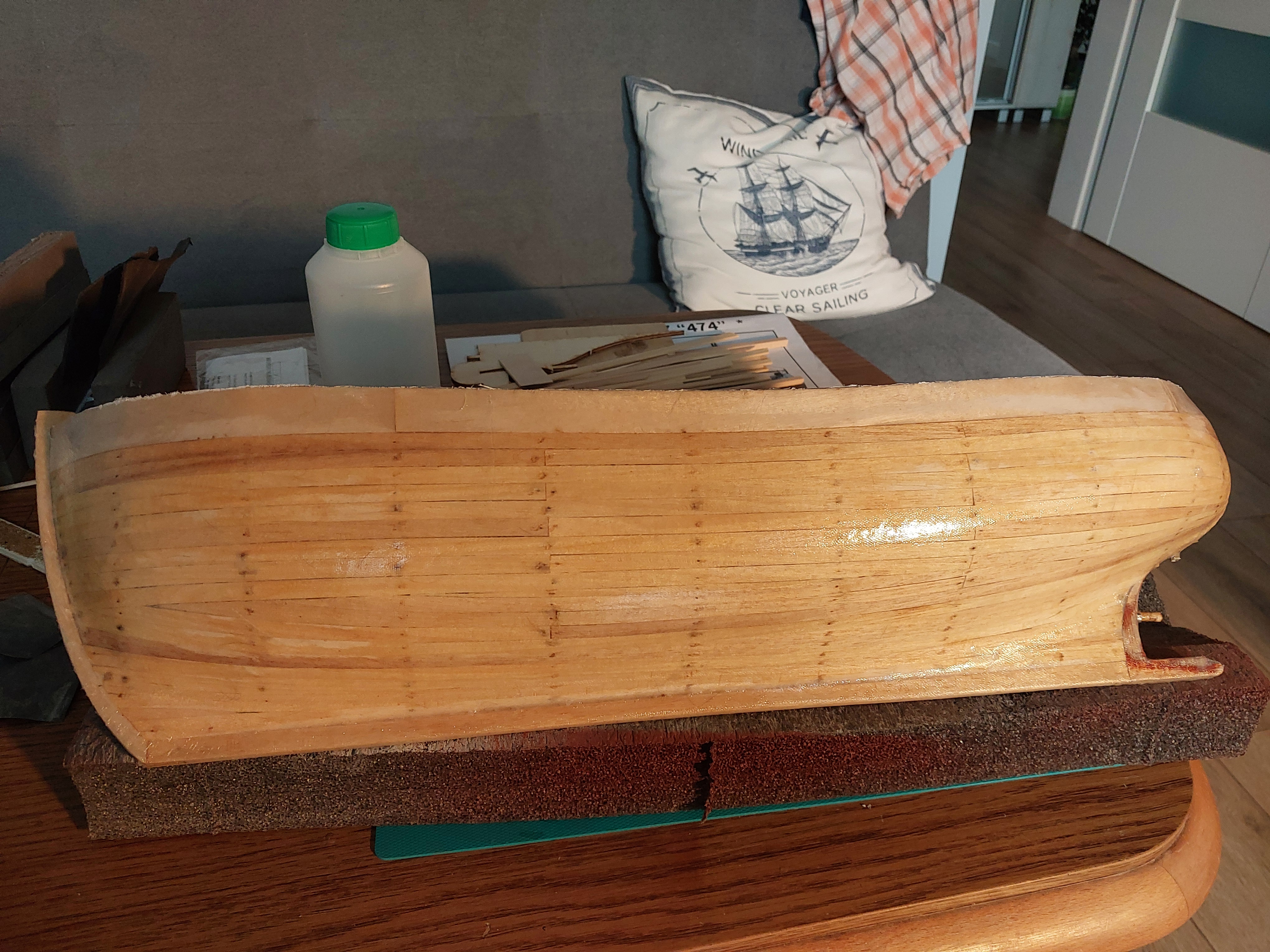 Witam Kolegów prace nad kutrem powoli postępują (Jak już wspominałem dzielę czas między lotniczy temat poboczny w 1/72 a model statku). Ostatnio wyszlifowałem kadłub i położyłem dwie warstwy laminatu co dokumentuję stosownym zdjęciem.