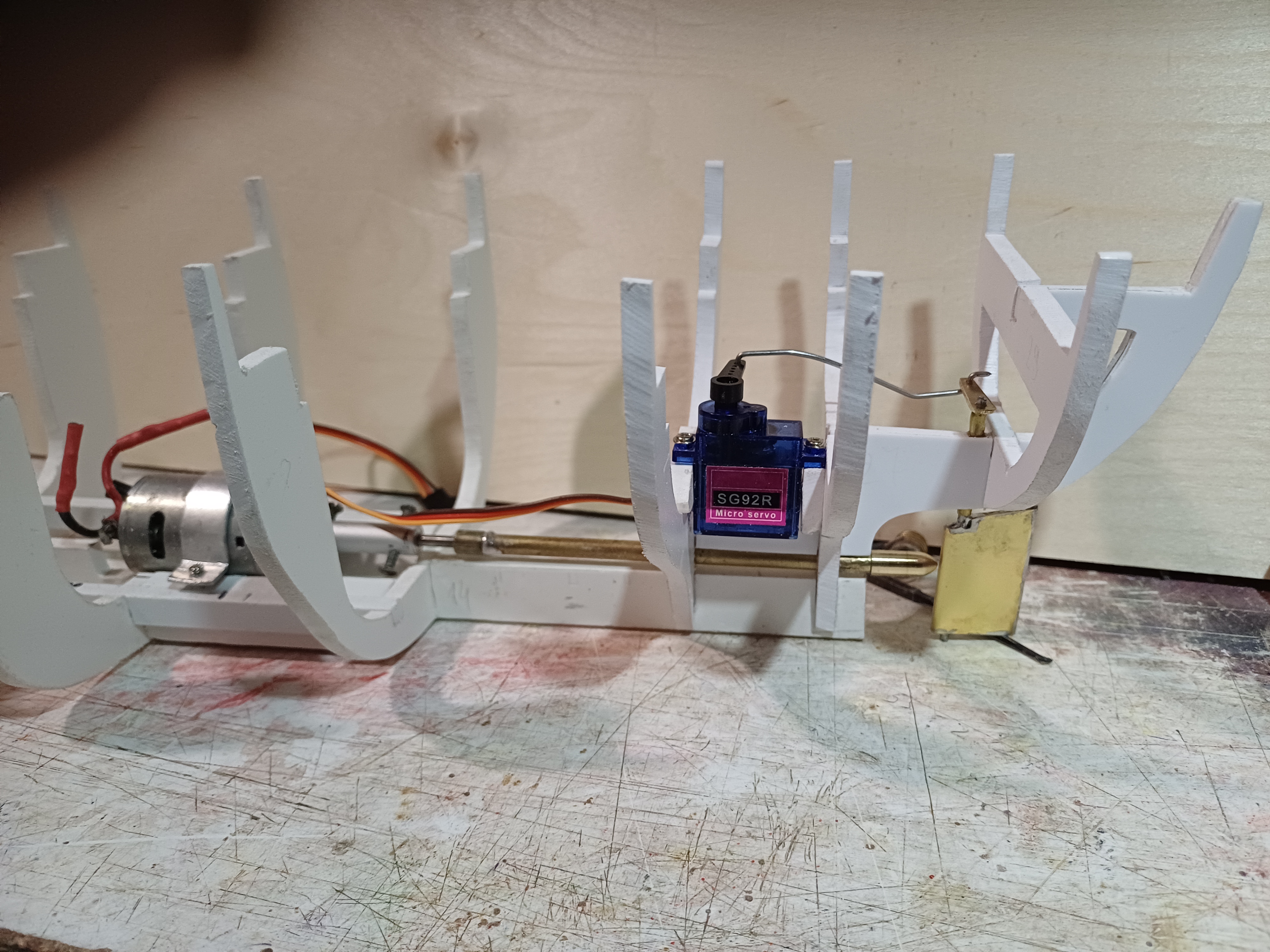 Witam przy budowie kutra poczyniłem pewne postępy. Szkielet jest już zmontowany na tym etapie wstępnie montuje wyposażenie RC jako, iż model nie posiadał "fabrycznego" przystosowania do tego celu a kadłub jest dość mały to w tej chwili łatwej mi wprowadzać konieczne modyfikacje w szkielecie. Zastosowane napęd to silnik 40o wraz z przekładnią 3:1 graupner.