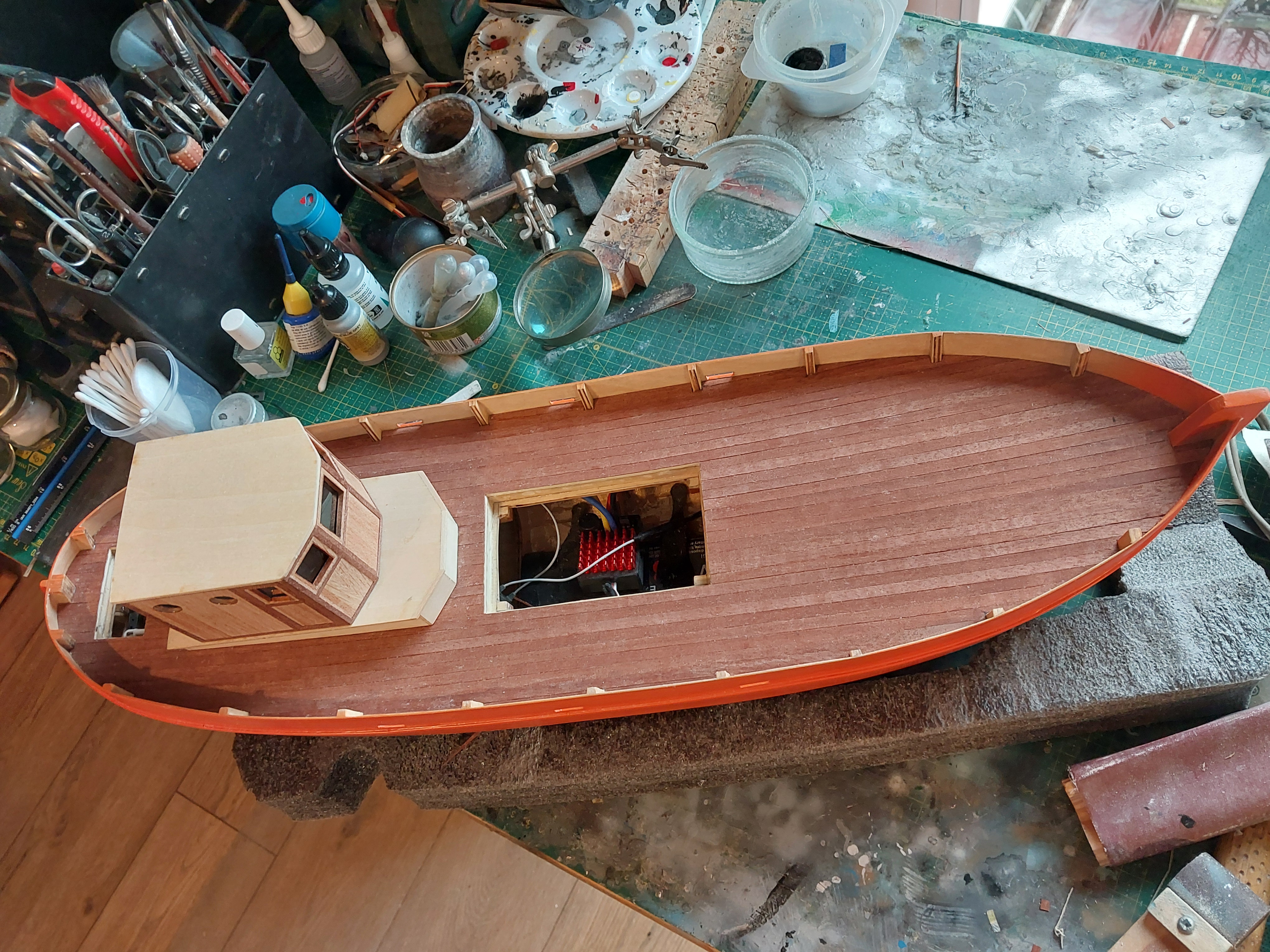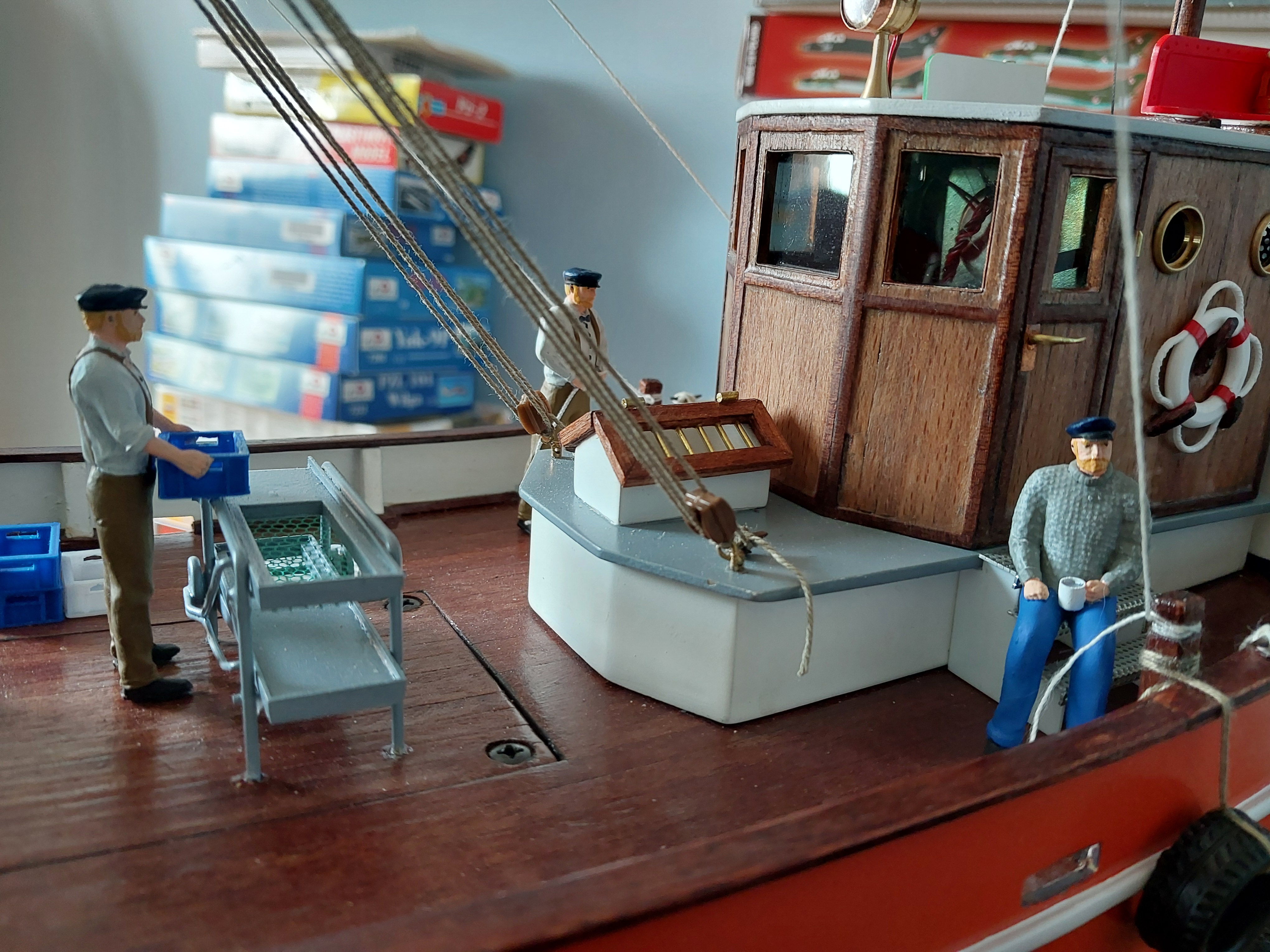 Witam Kolegów. Przedstawiam kolejne zdjęcia z postępów prac przy kutrze. Zdecydowałem się zostawić te wsporniki nadburcia tak jak to było przewidziane w zestawie. Powód? model ma być taki raczej "for fun" więc staram się unikać bardzo delikatnych elementów a burty są z dość cienkiej sklejki więc zależy mi na sztywności tych elementów. Pokład i sterówkę trzeba będzie teraz pomalować żywicą aby te elementy uwodoodpornić.