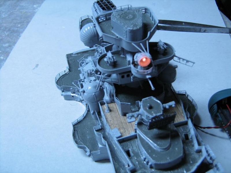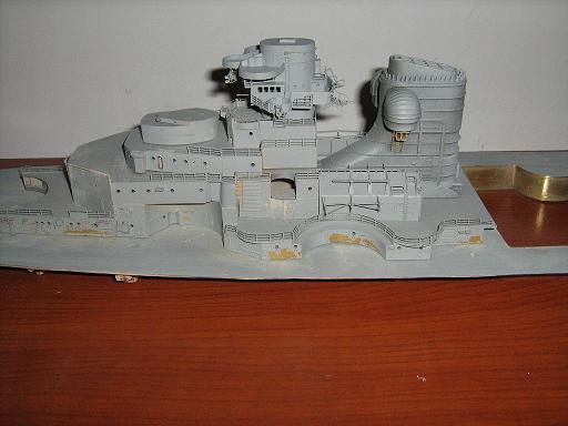 przykładem kolegi Rudi-ratlos z forum "wir bauen die Bismarck..."wykonałem w pokładzie otwory o kształcie rzutów nadbudówek. Jak widac na ilustracjach krawędzie wznocniłem wklejając na żywicę taśmę miedzianą.