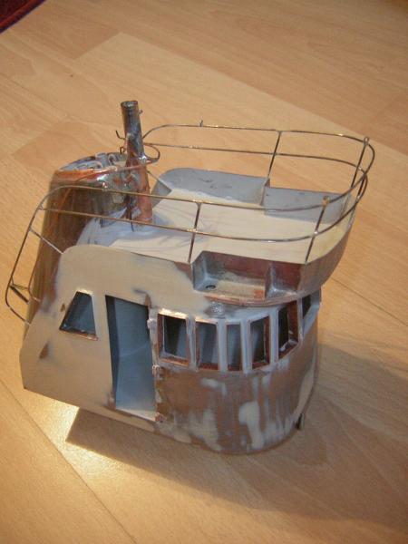 Wszystkim dziękuje za dobre rady:) , postępy przy sterówce idą na przód zdążyłem zrobić nowy reling z drutu stalowego 1mm otóż pisałem ze zrobię lepszy dlatego ze poprzedni był z drutu miedzianego który był bardzo giętki , stalowy będzie na wieki:laugh: . Zabrałem się za wykańczanie , trochę po szpachlowałem szpachlówką poliestrową i prysnąłem farbą podkładową i tak będzie trzeba z dwa razy jeszcze pokładówką i na mokro papierem ściernym polerować do samej gładzi.