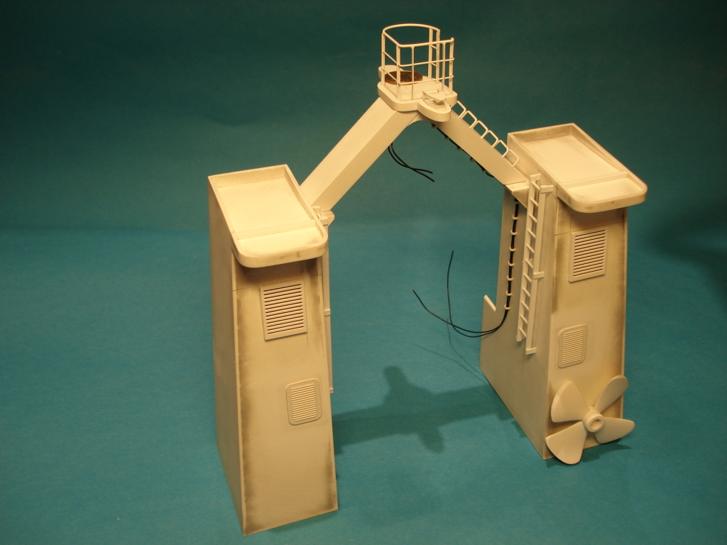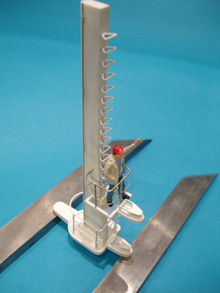 Zrobiłem z kawałka polistyrenu 0,25 mm , 0,5 mm i rurki plasticzanej trzon masztu . Wykonawszy "szkielet" masztu , owinąłem go na kształt cienkim polistyrenem.
