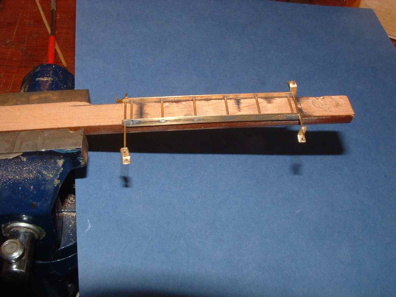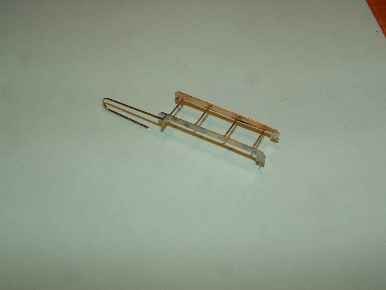Dziś rozpocząłem „produkcje” drabin pierwsza z nich prowadząca na górny pokład sterówki gotowa , blaszka mosiężna 0,4mm trochę drucika cyna kwas do lutowania no i oczywiście lutownica